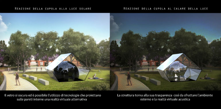 La luce architetto dell’ombra. Riflettendo sulle teorie della luce di Vico Magistretti e sull’analisi delle forme geometriche nei suoi progetti, nasce un ambiente che da origine ad una realtà alternativa ispirata a quella circostante, osservano le studentesse della 5 design. “La conquista della notte da parte della luce artificiale rende invisibili le stelle generando inquinamento luminoso. Il progetto è composto da una cupola in vetro oscurabile, con pannelli fotovoltaici, per rendere l’ambiente auto-sostenibile e la struttura in policarbonato trasparente che la sormonta, costituisce una barriera acustica. L’oscurità della calotta di giorno crea un ambiente protetto, uno spazio per pensare o svolgere attività collettive isolandosi dal caos che oggi abita la città. La trasparenza nella fase serale, apre al visitatore un contatto con la realtà circostante dal punto di vista sensoriale. Una specie di realtà virtuale – concludono le allieve del Munari – che invece di farci viaggiare in mondi esotici, ci consente di apprezzare ciò che abbiamo intorno”.