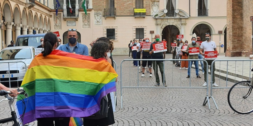 Due piazze antagoniste oggi, a Crema. In mezzo, decine di operatori delle forze dell’ordine per garantire l’ordine pubblico. Transennata piazza Duomo, dove le Sentinelle in Piedi hanno silenziosamente sostato per un’ora, cartelloni alla mano, protestando contro il Ddl Zan. Dall’altra parte della “vasca”, contrapposto non solo fisicamente, il presidio di Sinistra Classe e Rivoluzione, a sostegno della Legge contro l’omotransfobia.