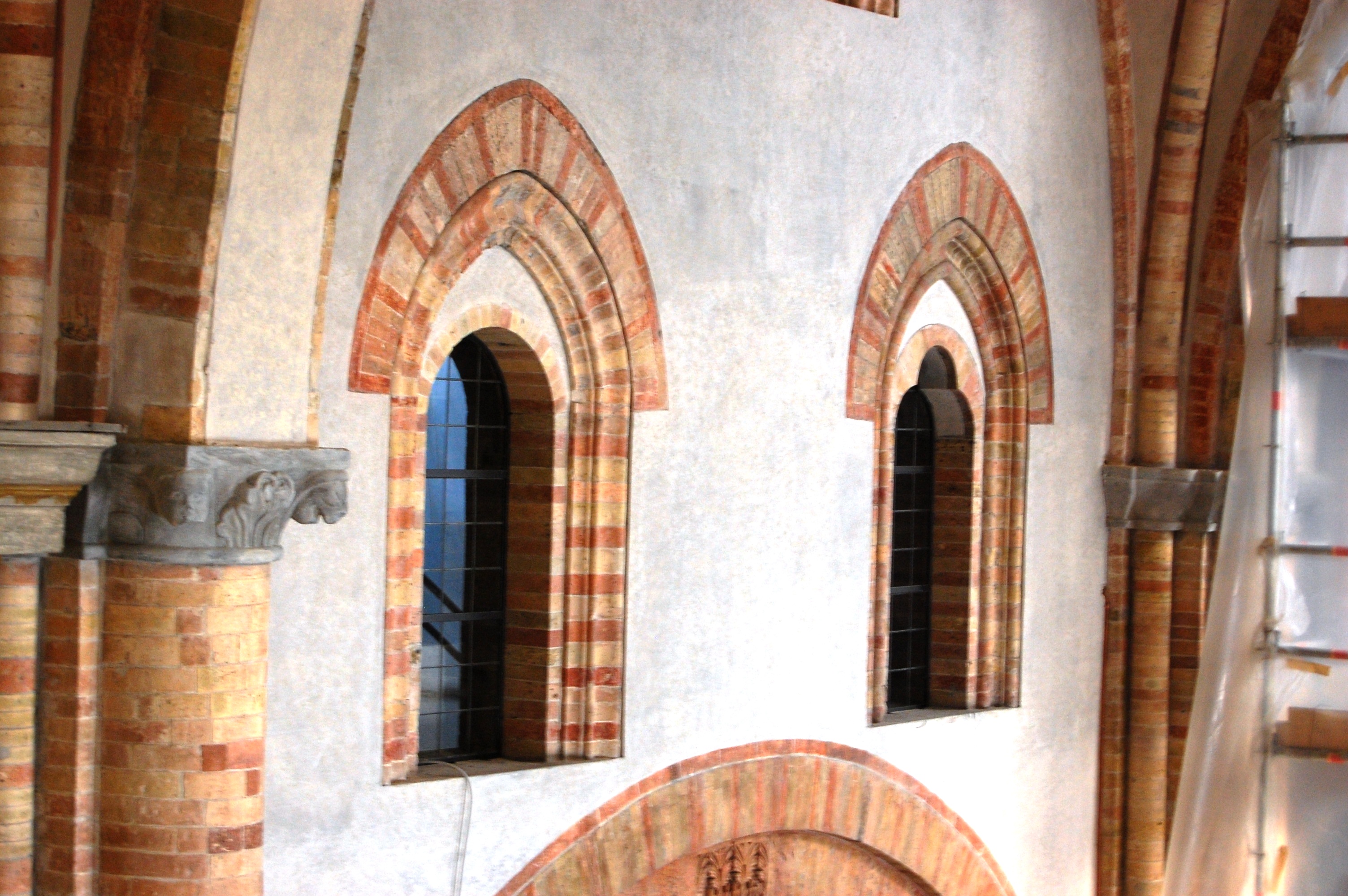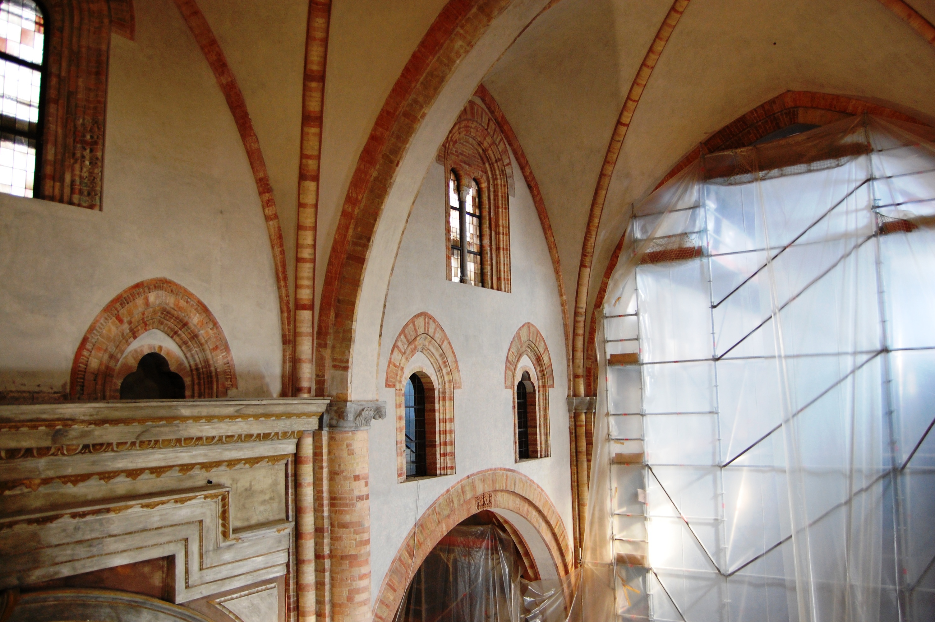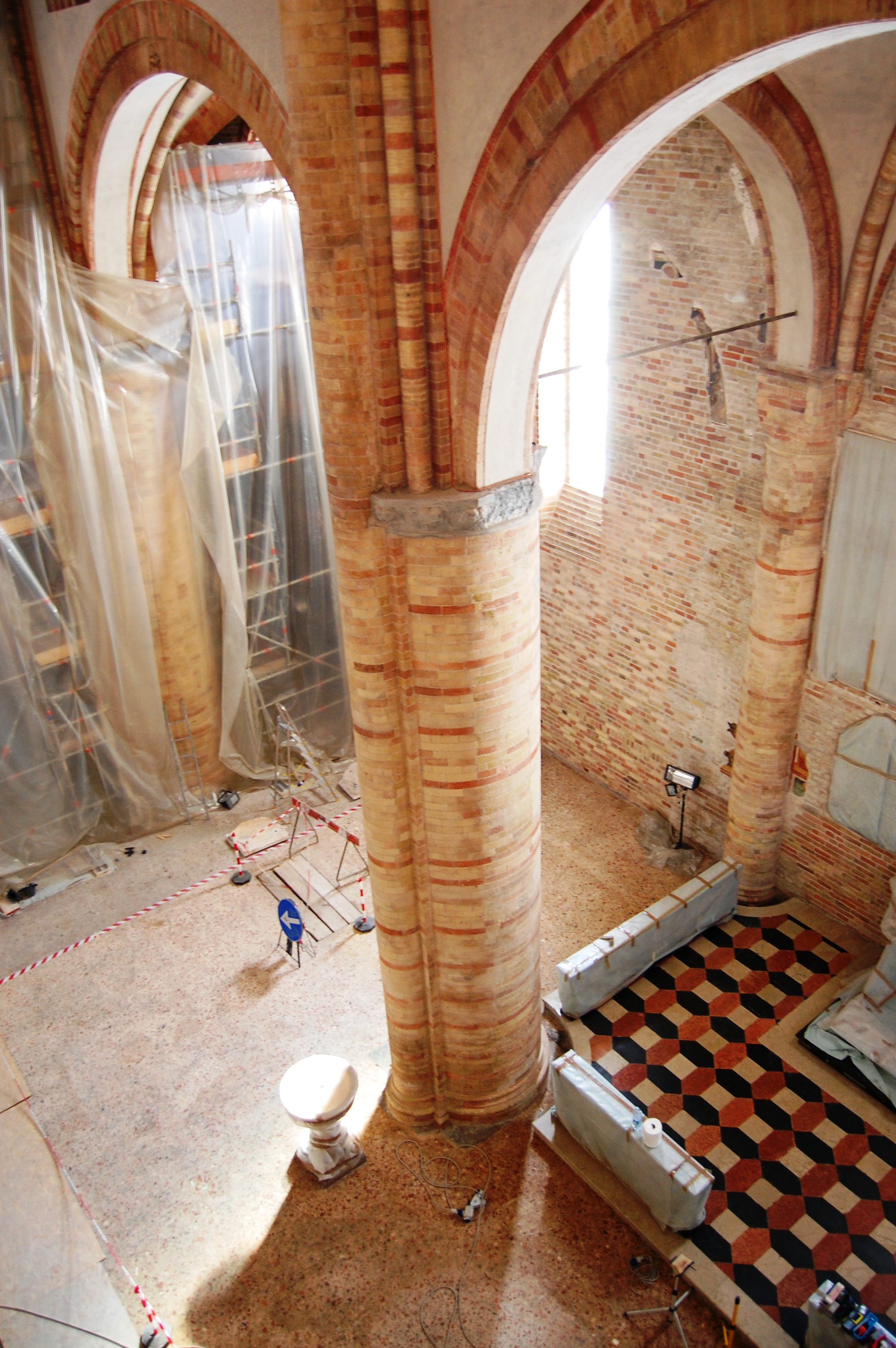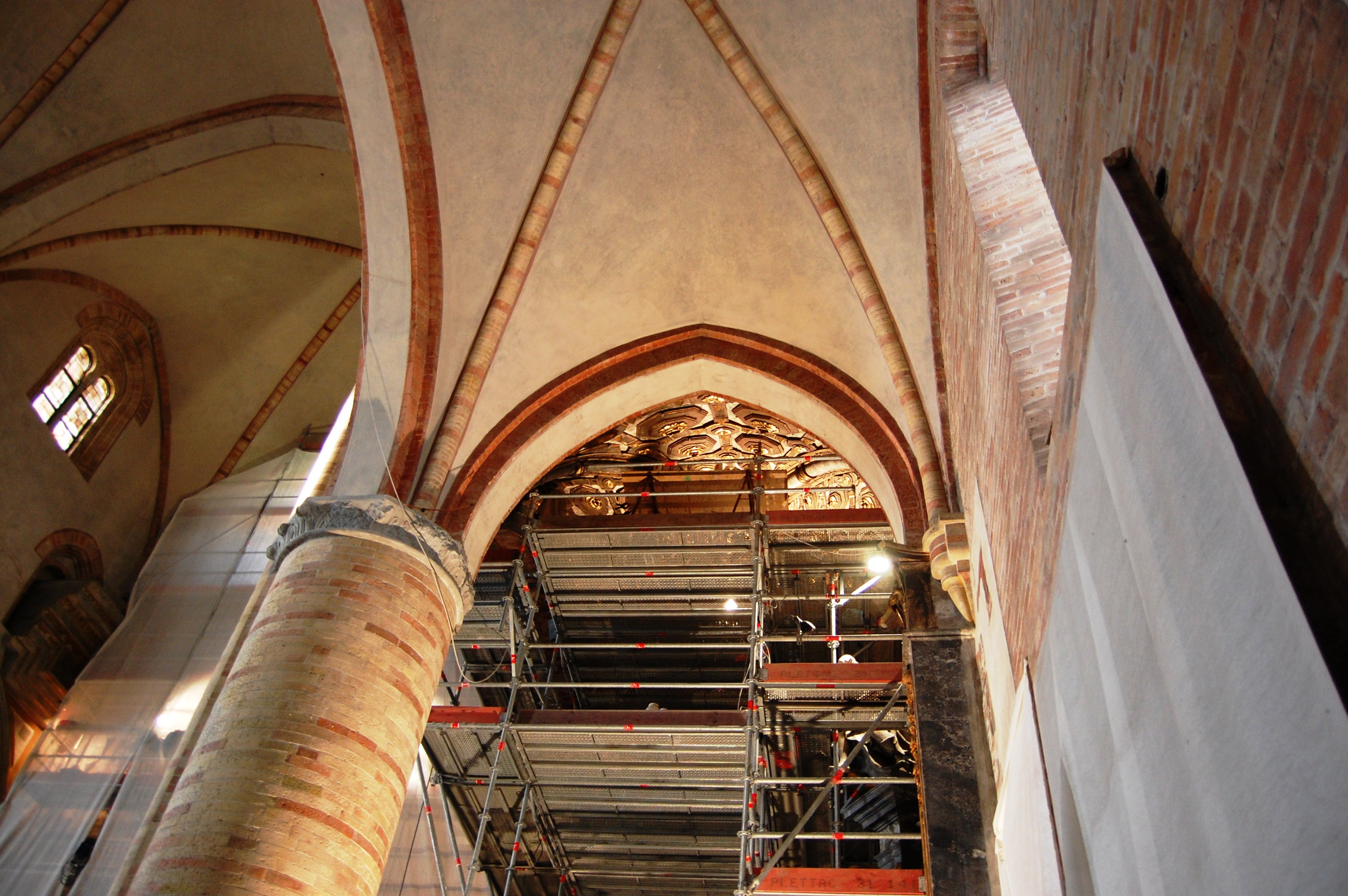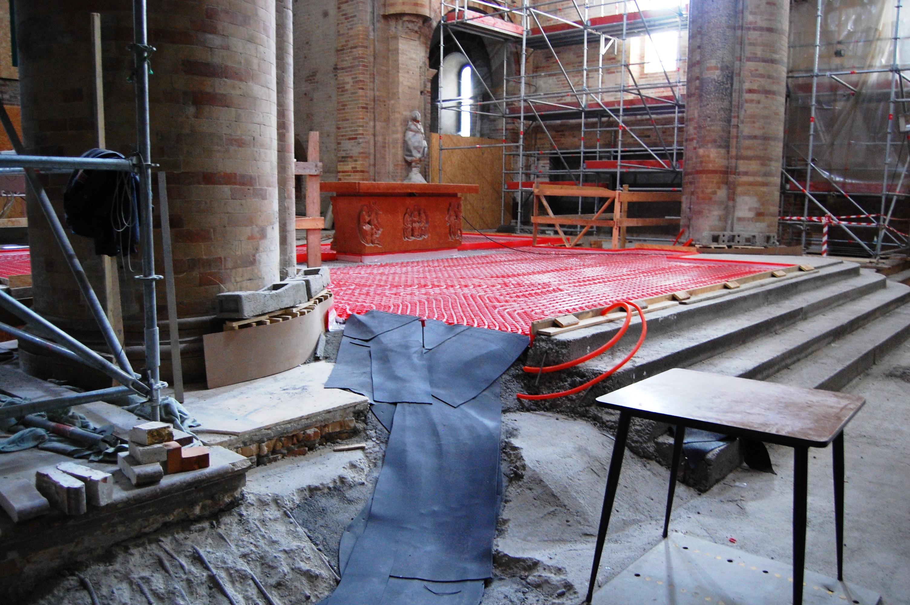 Le prime due campate delle tre navate sono state completate: pulitura del cotto, dei serramenti, delle pareti intonacate, delle parti in pietra, con un’attenzione particolare alle volte dove è stata mantenuta la tonalità d’intonaco originaria scoperta durante la pulitura. Resta in sospeso l’Altare della Madonna laterale, dove i restauratori sono tuttora all’opera per il recupero degli affreschi e la sistemazione della copertura lignea della volta. Nella zona di fronte all’altare è in posa il sistema di riscaldamento interrato, mentre sul resto del pavimento già ripulito un pool di restauratori sta sanando le piccole fessure tra i frammenti di pietra con una pasta di coccio pesto realizzata ad hoc. Il rosone che occupa la facciata nord della Cattedrale è stato smontato “petalo per petalo” per permettere una pulitura efficace e in seguito riassemblato; per proteggerlo è stato costruito un secondo telaio metallico identico all’originale ma con vetro trasparente, che verrà applicato  sul lato esterno in modo da diventare una copertura invisibile. Stessa operazione per le vetrate, una delle quali era già stata rovinata a causa di probabile un atto di vandalismo; anche in questo caso gli artigiani hanno creato vetrate di protezione “invisibili” ma efficaci.