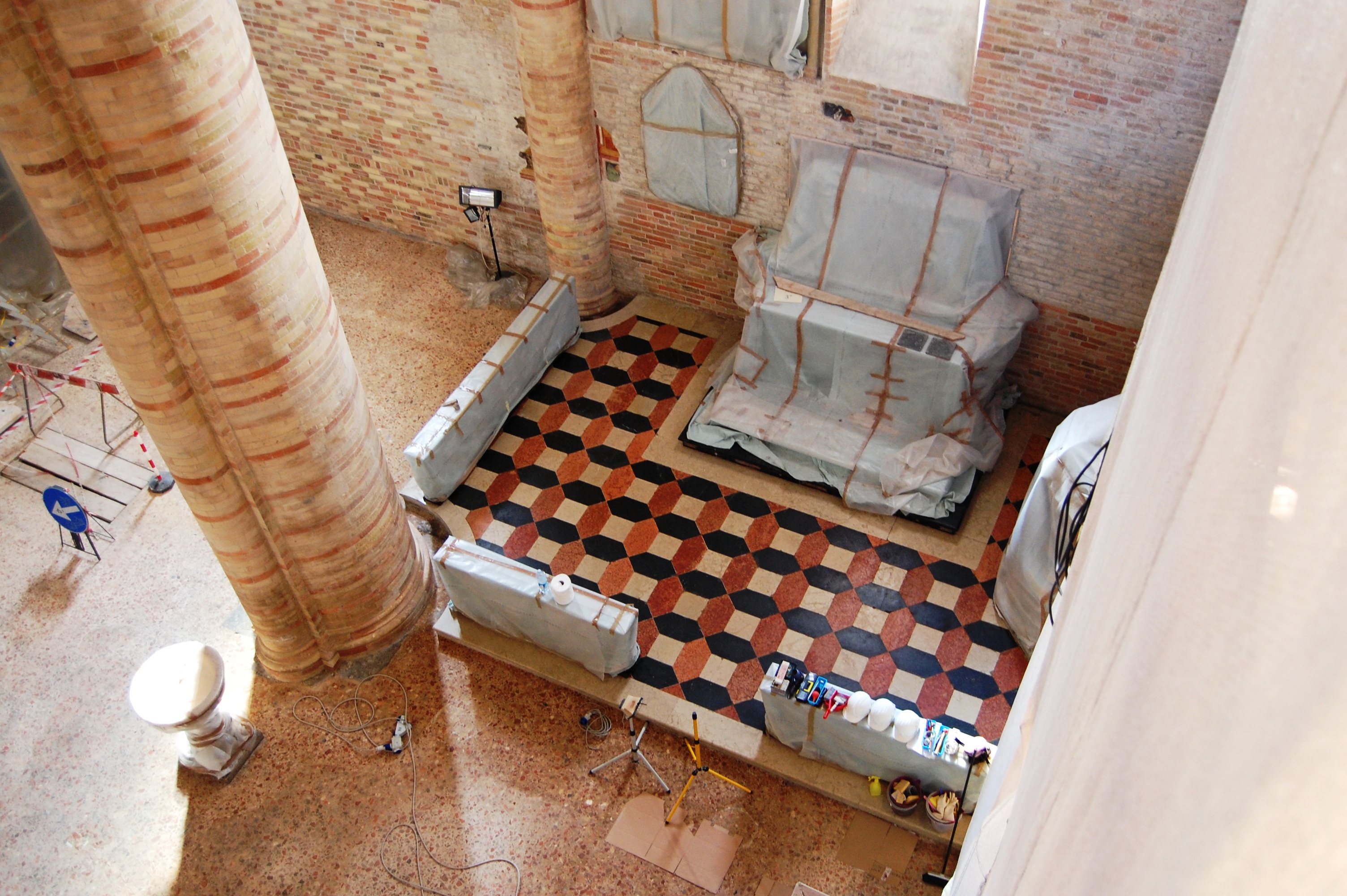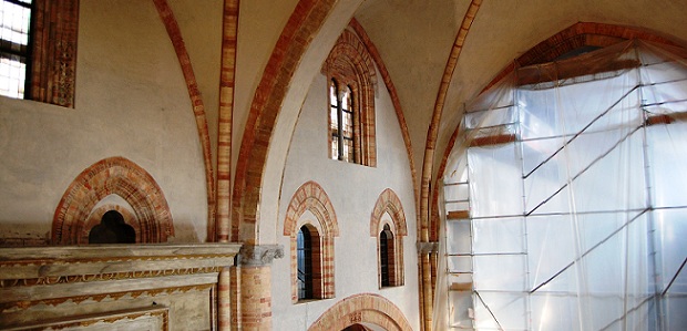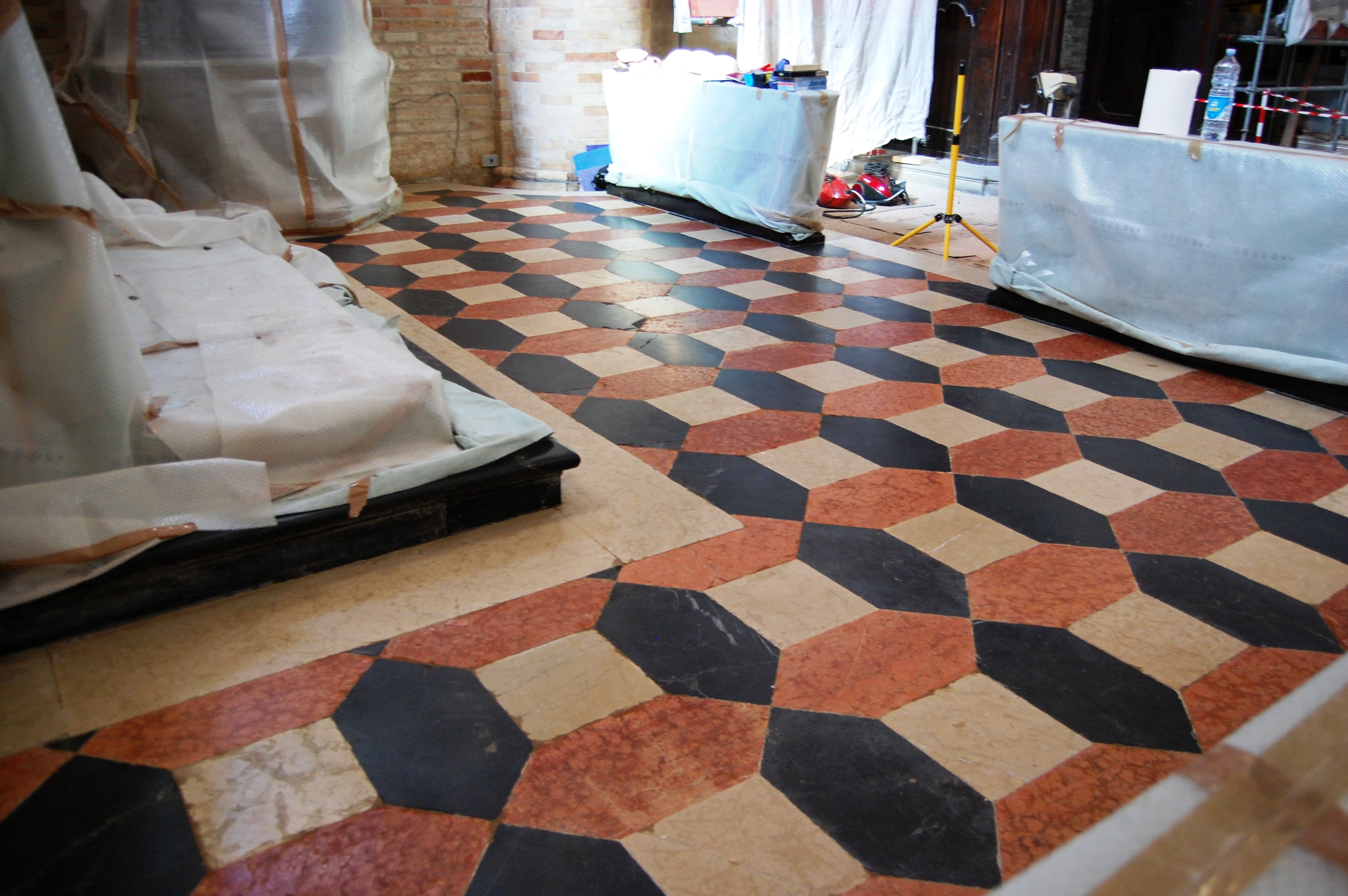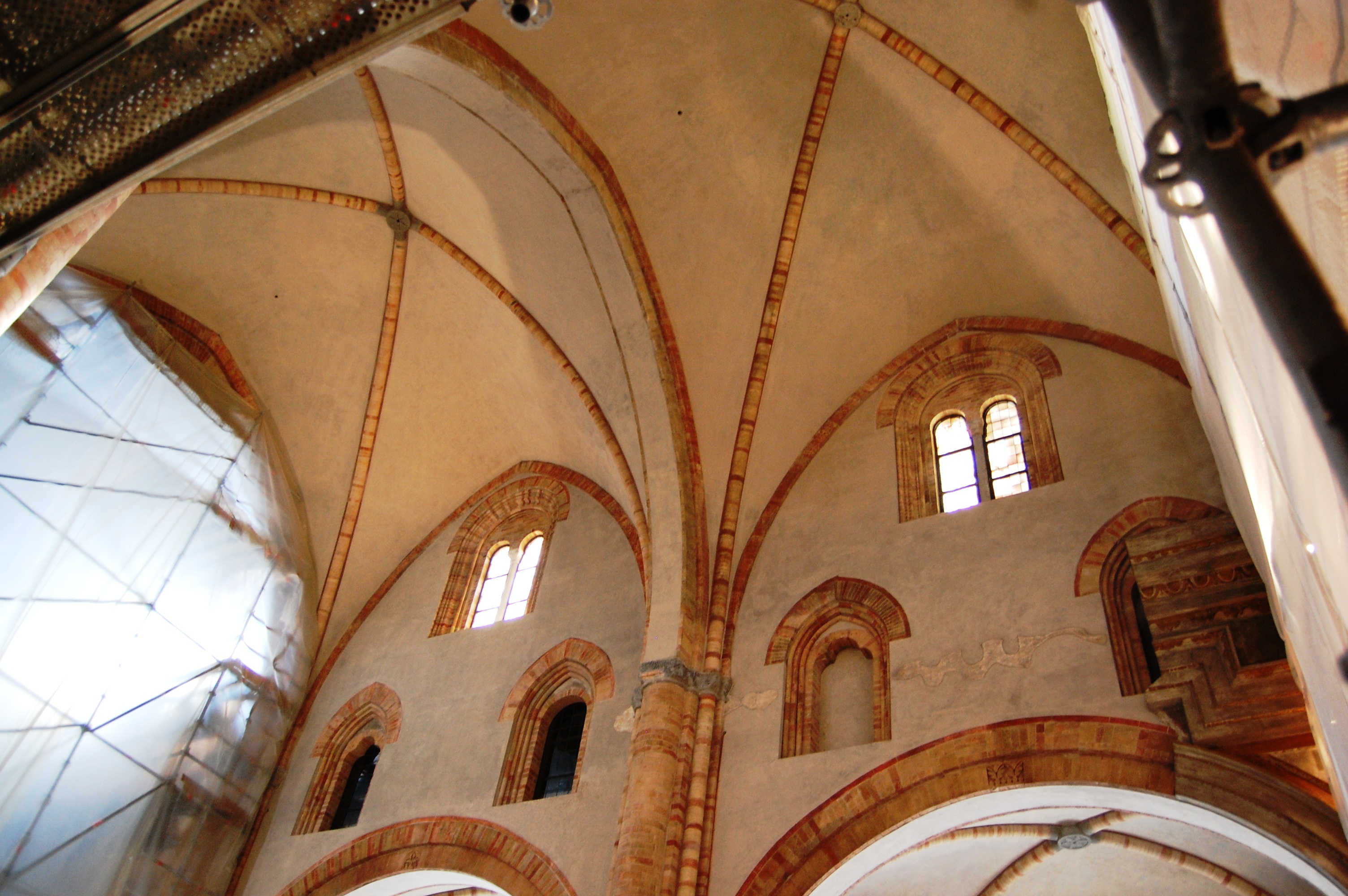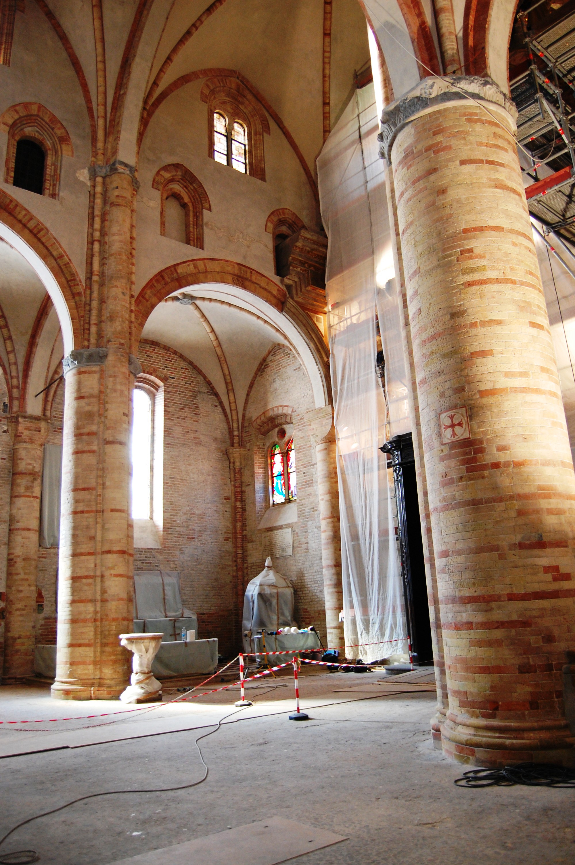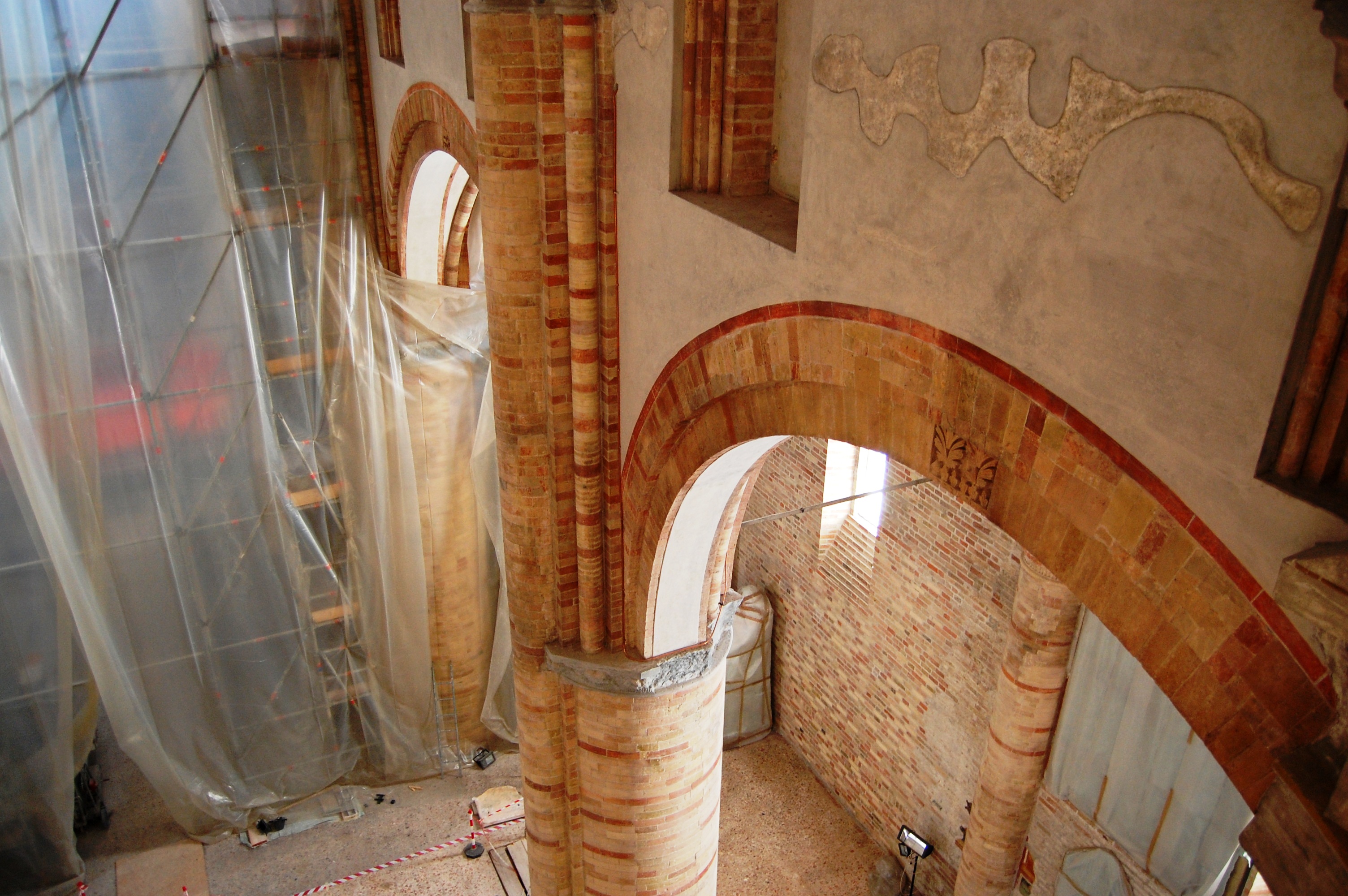 Le prime due campate delle tre navate sono state completate: pulitura del cotto, dei serramenti, delle pareti intonacate, delle parti in pietra, con un’attenzione particolare alle volte dove è stata mantenuta la tonalità d’intonaco originaria scoperta durante la pulitura. Resta in sospeso l’Altare della Madonna laterale, dove i restauratori sono tuttora all’opera per il recupero degli affreschi e la sistemazione della copertura lignea della volta. Nella zona di fronte all’altare è in posa il sistema di riscaldamento interrato, mentre sul resto del pavimento già ripulito un pool di restauratori sta sanando le piccole fessure tra i frammenti di pietra con una pasta di coccio pesto realizzata ad hoc. Il rosone che occupa la facciata nord della Cattedrale è stato smontato “petalo per petalo” per permettere una pulitura efficace e in seguito riassemblato; per proteggerlo è stato costruito un secondo telaio metallico identico all’originale ma con vetro trasparente, che verrà applicato  sul lato esterno in modo da diventare una copertura invisibile. Stessa operazione per le vetrate, una delle quali era già stata rovinata a causa di probabile un atto di vandalismo; anche in questo caso gli artigiani hanno creato vetrate di protezione “invisibili” ma efficaci.
