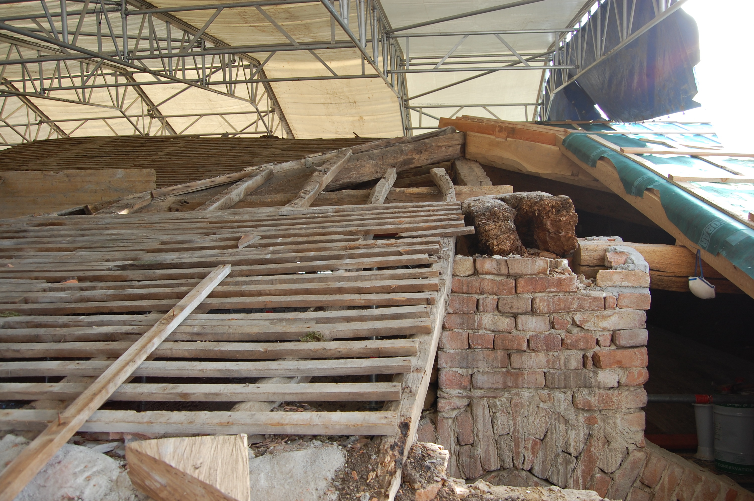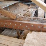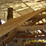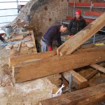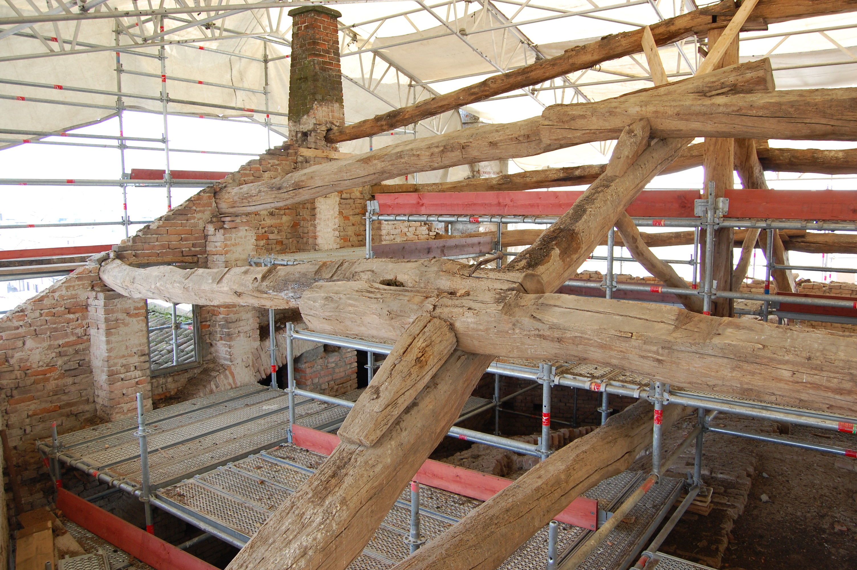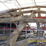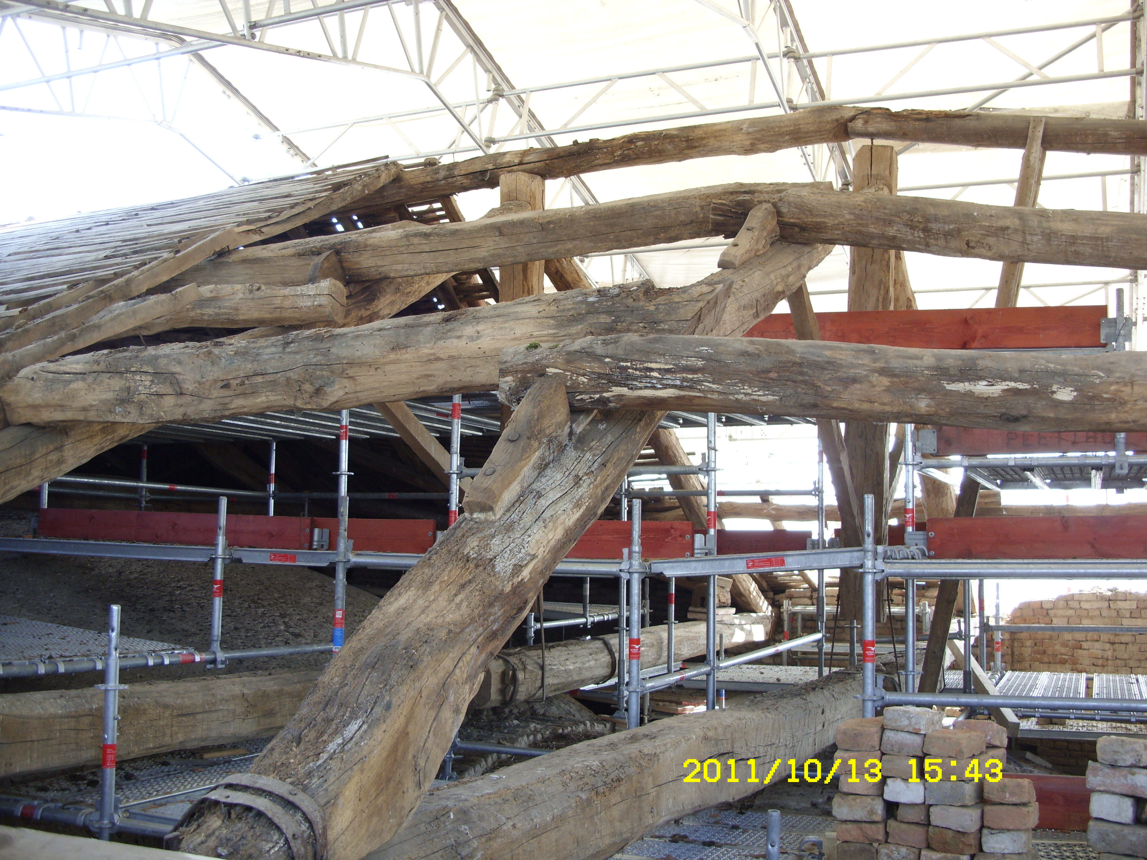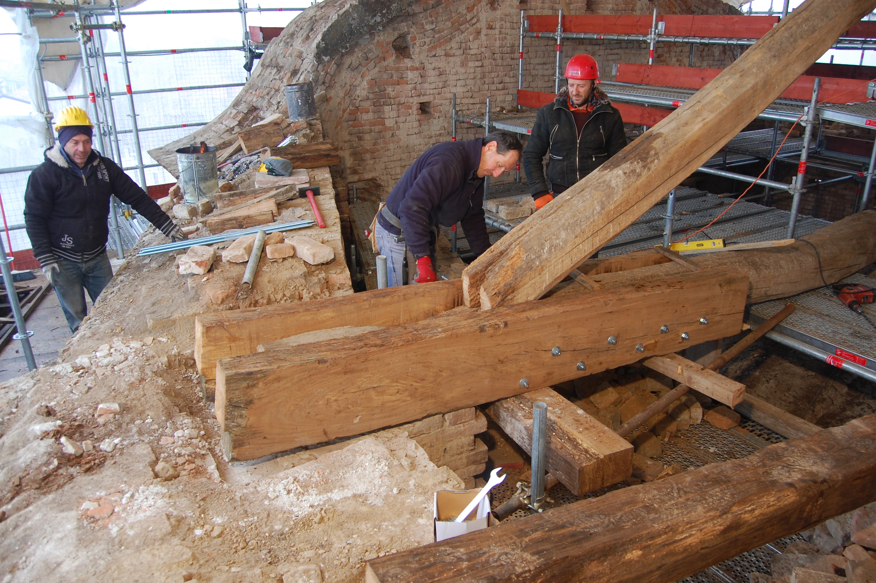 Una volta scoperchiato il tetto è iniziato il lavoro di recupero vero e proprio, levando tutto il materiale guastato dagli anni e dalle intemperie. L’architetto Emiliano Campari, responsabile dei lavori, ha valutato con attenzione lo stato delle orditure che sostengono il tetto: le imponenti travi lignee erose dal tempo e dalle infiltrazioni d’acqua avevano fortunatamente mantenuto una certa compattezza. Per salvare la struttura originaria il team tecnico ha fatto ricorso al metodo studiato dall’architetto italiano Franco Laner, pioniere nell’utilizzo del legno lamellare. “E’ un’opera difficile che richiede una manovalanza specializzata – spiega il geometra Ferdinando Vacchi, responsabile della sicurezza sul cantiere – L’operazione di ‘incalmo’: consiste nell’eliminare la parte di legno deteriorata e innestare tramite bulloni o reggiature inserti di legno nuovo della stessa essenza”. Come si nota dalle foto, i “fettoni” fissati allo scheletro del tetto hanno permesso di rinforzare travi e capriate, evitando così di dover smantellare tutta la struttura. L’arduo compito è stato affidato a Bruno Paggi, che si è occupato di trovare rovere di slavonia e recuperare alcune travi vecchie da riutilizzare come legname per intagliare rinforzi e appoggi.