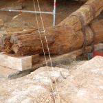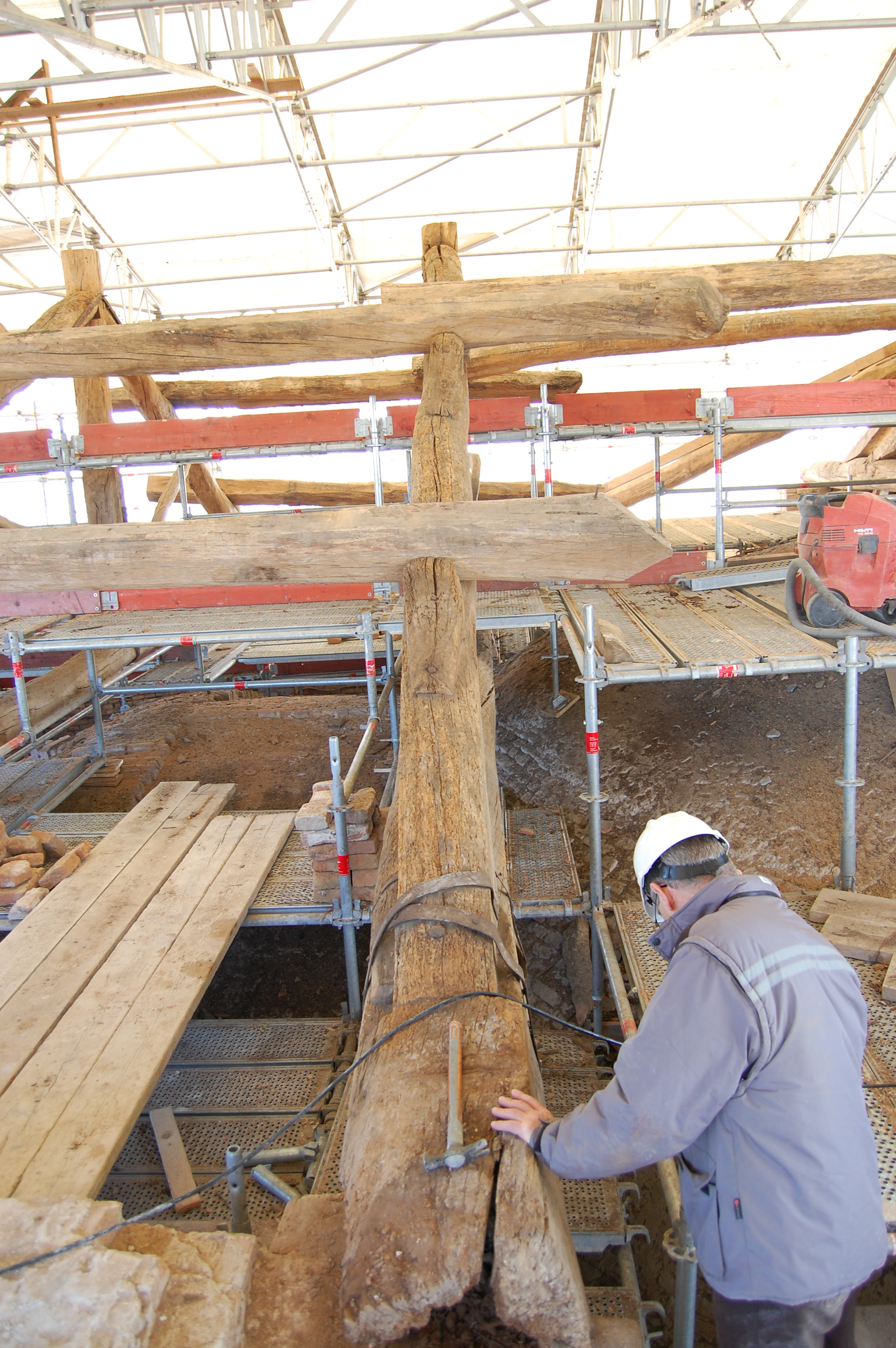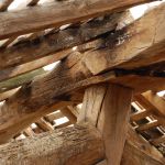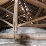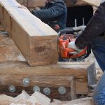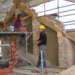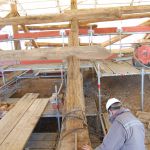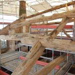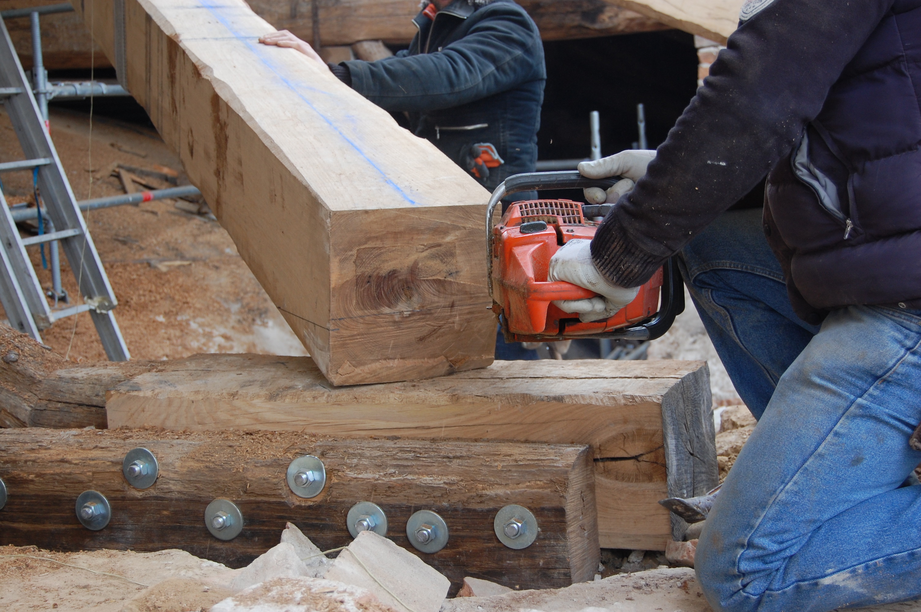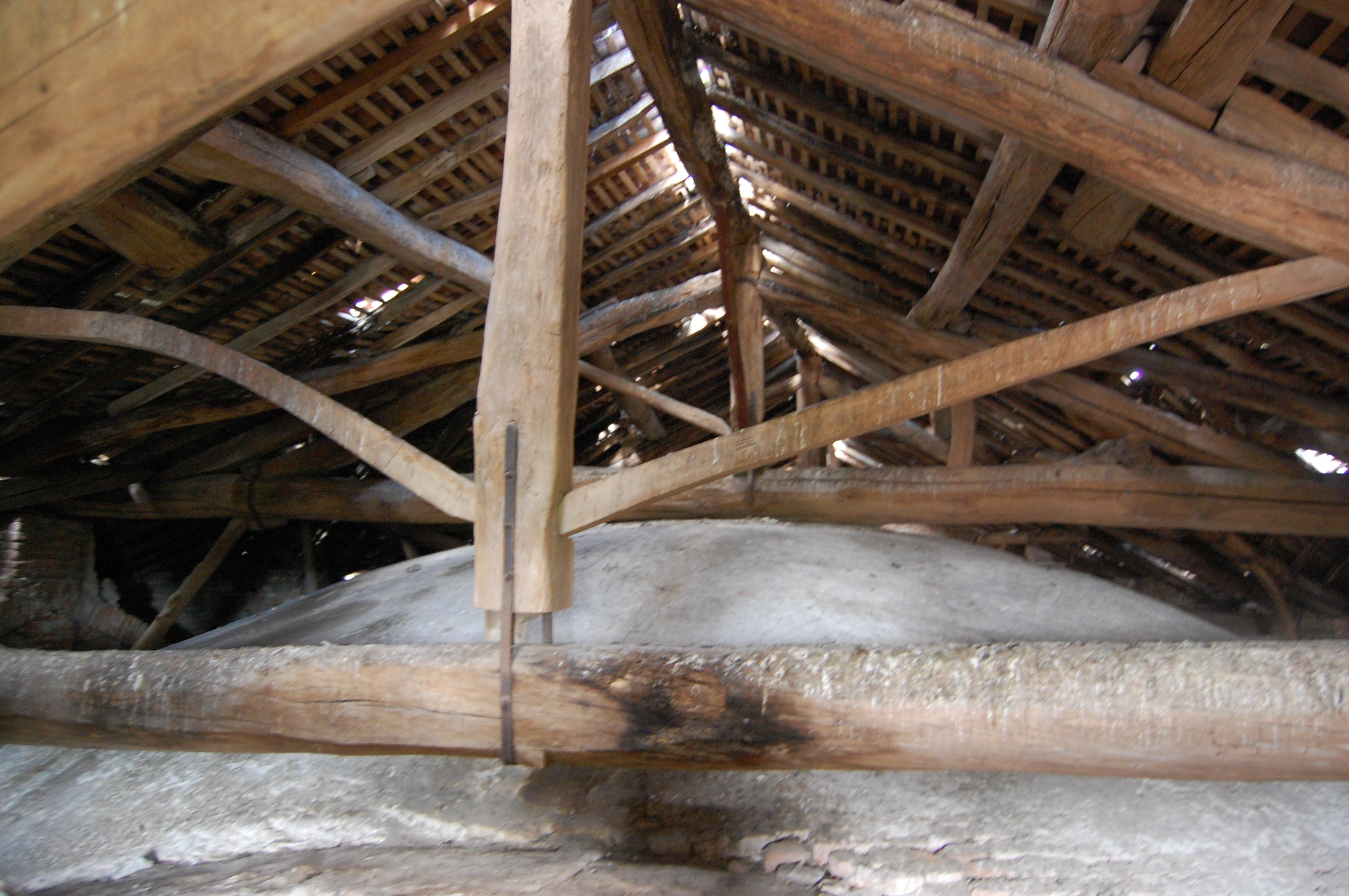 Una volta scoperchiato il tetto è iniziato il lavoro di recupero vero e proprio, levando tutto il materiale guastato dagli anni e dalle intemperie. L’architetto Emiliano Campari, responsabile dei lavori, ha valutato con attenzione lo stato delle orditure che sostengono il tetto: le imponenti travi lignee erose dal tempo e dalle infiltrazioni d’acqua avevano fortunatamente mantenuto una certa compattezza. Per salvare la struttura originaria il team tecnico ha fatto ricorso al metodo studiato dall’architetto italiano Franco Laner, pioniere nell’utilizzo del legno lamellare. “E’ un’opera difficile che richiede una manovalanza specializzata – spiega il geometra Ferdinando Vacchi, responsabile della sicurezza sul cantiere – L’operazione di ‘incalmo’: consiste nell’eliminare la parte di legno deteriorata e innestare tramite bulloni o reggiature inserti di legno nuovo della stessa essenza”. Come si nota dalle foto, i “fettoni” fissati allo scheletro del tetto hanno permesso di rinforzare travi e capriate, evitando così di dover smantellare tutta la struttura. L’arduo compito è stato affidato a Bruno Paggi, che si è occupato di trovare rovere di slavonia e recuperare alcune travi vecchie da riutilizzare come legname per intagliare rinforzi e appoggi.
