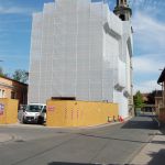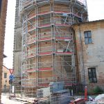 Per procedere con i lavori anche durante l’inverno è stata realizzata una copertura mobile formata da uno scheletro metallico coperto da teli impermeabili: la struttura è stato spostata lungo il tetto per permettere a muratori e operai di lavorare al coperto e in sicurezza, al riparo da freddo e intemperie. L’idea iniziale consisteva nel realizzare una copertura mobile che potesse scorrere su rotaie lungo il corpo dell’edificio, ma la struttura irregolare della chiesa barocca ha creato non pochi problemi, costringendo i lavoratori a spostare di volta in volta l’intero scheletro.