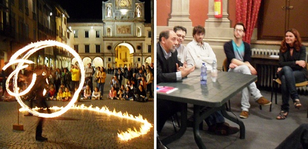 L’aria già arroventata dal comizio della Lega Nord organizzato in piazza Duomo è stata incendiata, poco più in là, dalle fiaccole di due artiste di strada che hanno offerto a bambini e adulti una performance di giocoleria suggestiva replicata più tardi di fronte all’ingresso del Sant’Agostino, dove la giovane e grintosa Sabrina 1 Sambolè ha ovverto una “Different night” tutta ritmo e musica al numeroso pubblico riunito presso il Caffè del Museo. Nell’itinerario della candidata di centrosinistra non è mancata una tappa alla conferenza con l’astronauta italiano Umberto Guidoni, invitato dalla sezione cremasca di Sinistra e Libertà per parlare di politica, istruzione, ricerca e progresso, un incontro che ha riempito la Sala della Musica dell’ex Folcioni di ascoltatori interessati. Verso le 22.30 anche il mercato austroungarico si è acceso di luci e musica con il “rhythm n’blues” dei Round Robin; poco più avanti, scendendo verso piazza Giovanni XXIII lungo via XX Settembre, quattro amici, qualche sedia e alcuni strumenti sono bastati ad improvvisare un gradito concerto in strada con il cantautore cremasco Gio Bressanelli, che ha fatto cantare i passanti con le note delle canzoni di stampo popolare più conosciute. Allo scoccare della mezzanotte si torna in piazza Duomo, dove per i partecipanti alla “notte gialla” è stato organizzato un tour dedicato agli scorci più suggestivi della città.