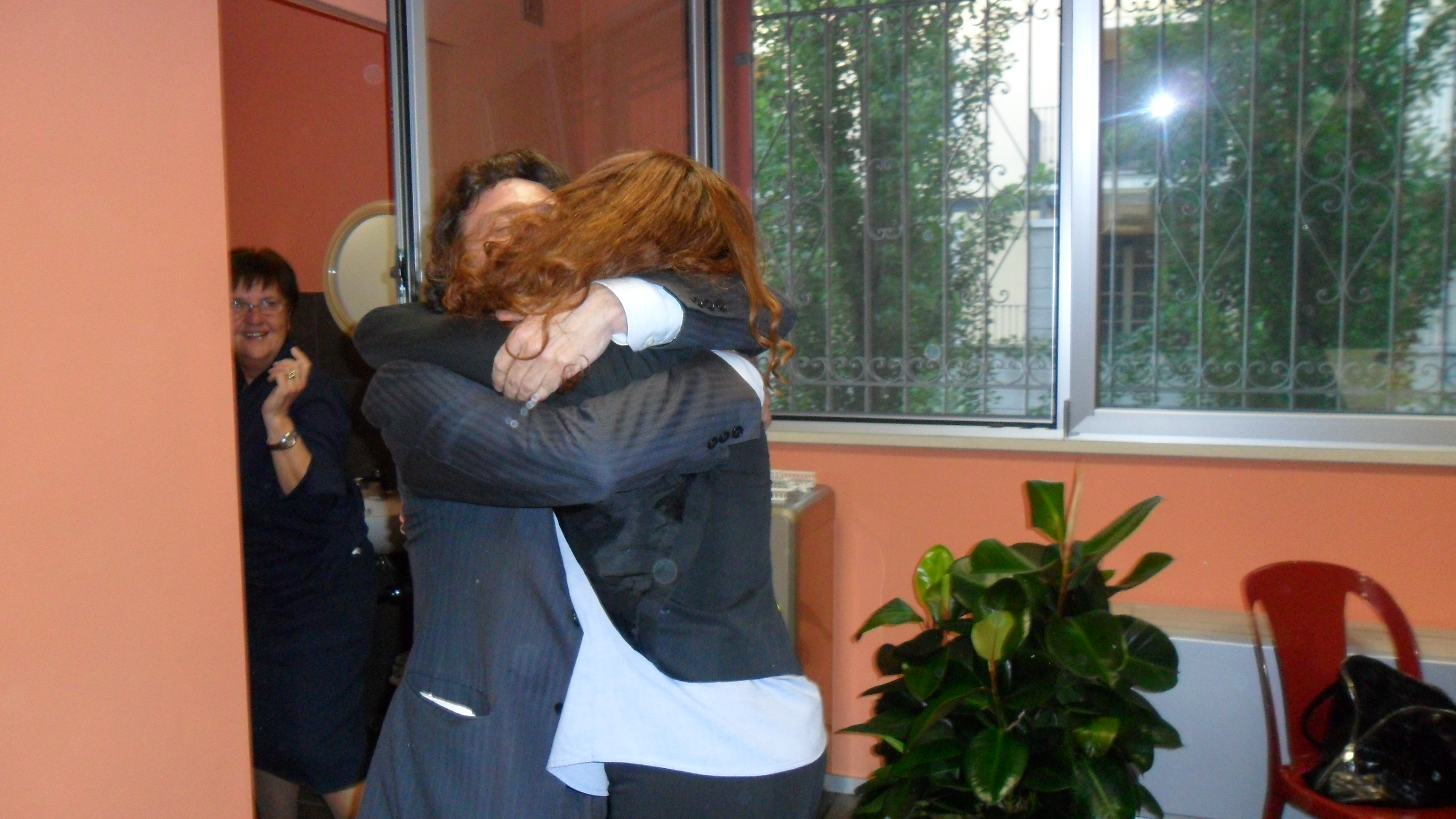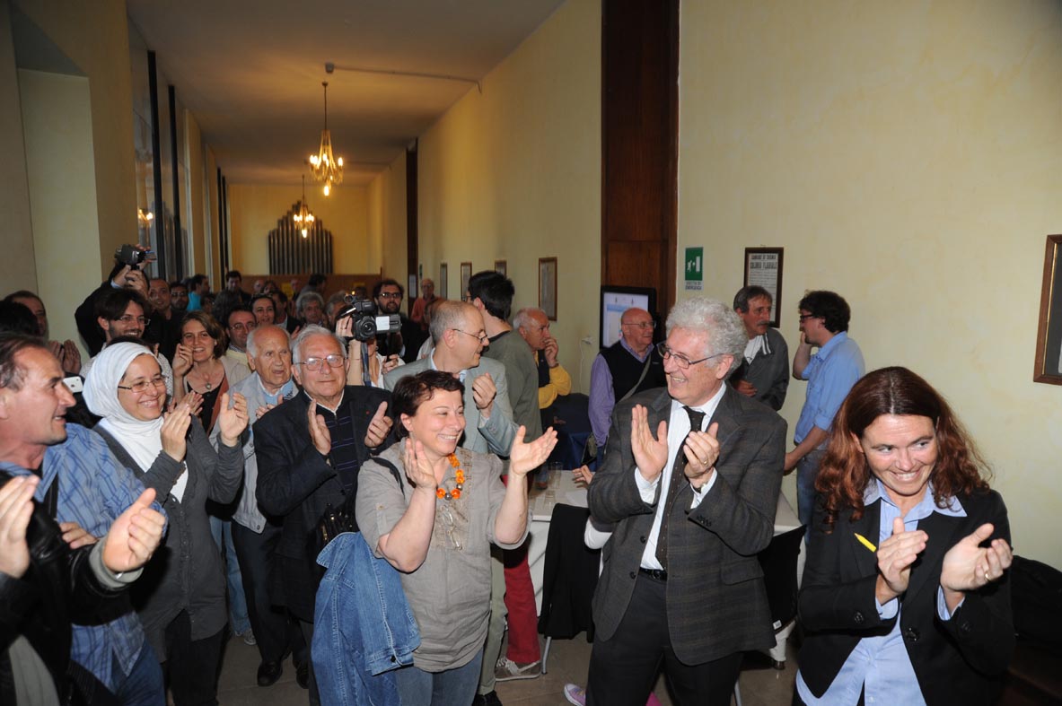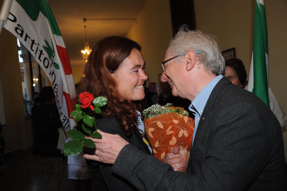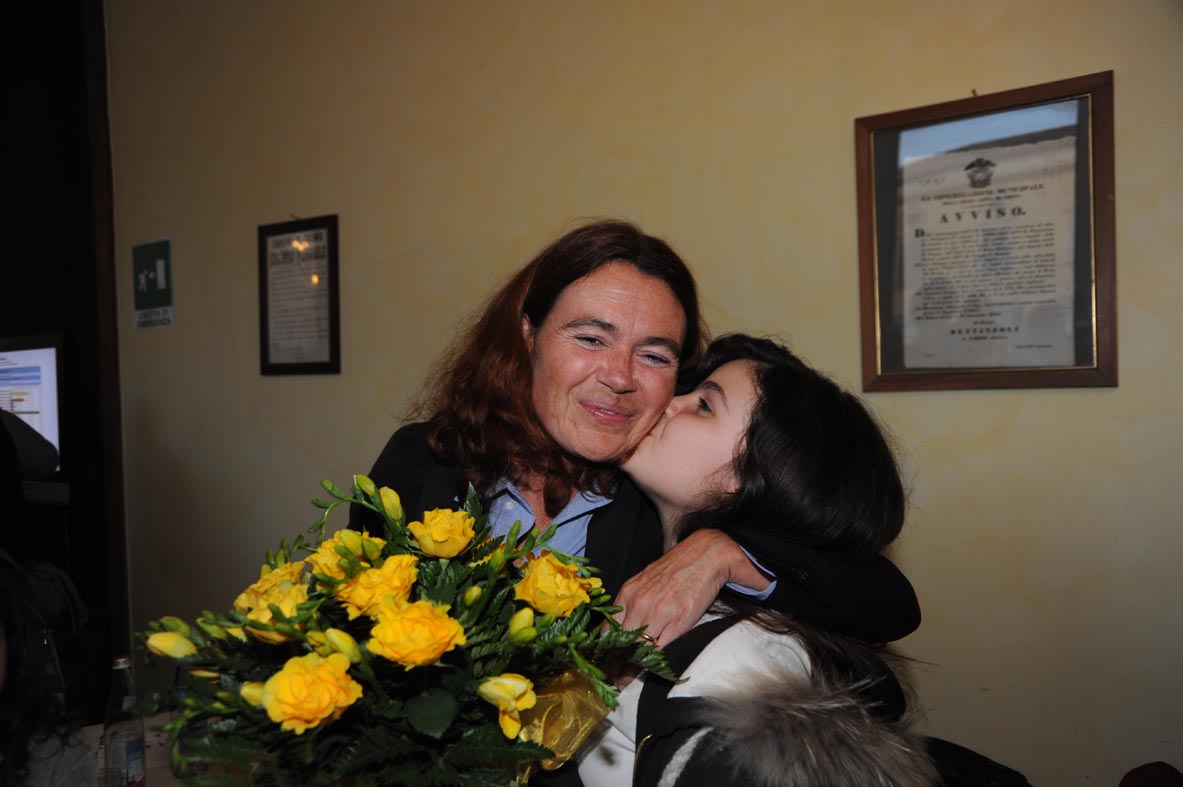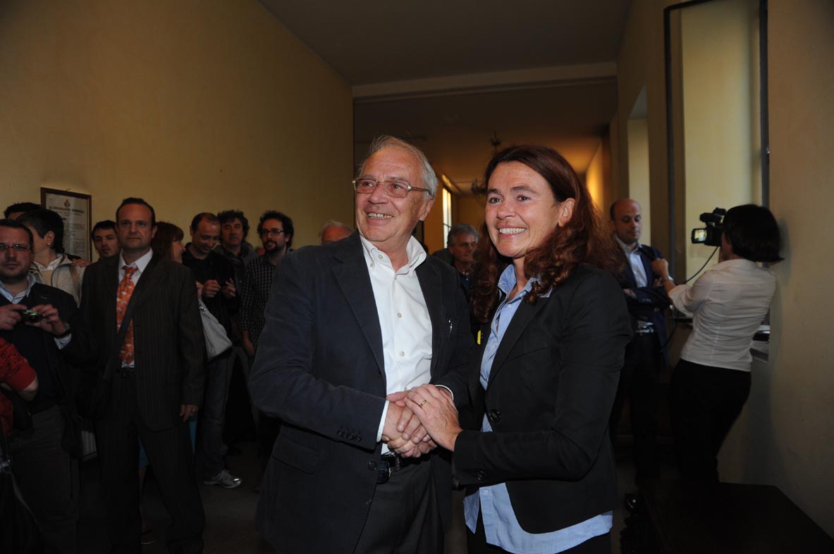I primi ringraziamenti vanno alla famiglia, il primo pensiero alla figlia che incontra e abbraccia di fronte a Palazzo Comunale. Ad aspettarla c’è già un gruppo di sostenitori in festa, le esaltazioni si susseguono, ma la candidata mantiene il sangue freddo e attende l’esito definitivo delle votazioni. Gli applausi la sospingono lungo la scalinata che porta alla galleria del piano superiore, è lì che incontra Antonio Agazzi, prima avversario politico, ora consigliere comunale di minoranza. Tra loro un saluto ancora carico delle tensioni accumulate negli ultimi mesi che si scioglie in una carezza accennata da parte di Bonaldi, ricambiata da uno sportivo augurio di buon governo. Ancora qualche passo verso la sala consiliare ed ecco l’incontro tra Stefania Bonaldi e l’ormai ex sindaco Bruno Bruttomesso, che con il consueto fare pacato le consegna in una stretta di mano le sorti della città. Ormai i risultati sono ufficiali, e l’euforia si riversa nuovamente in piazza Duomo dove partono i festeggiamenti: non più una notte gialla, ma un giorno nuovo per la politica di Crema.
