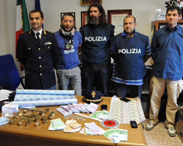 Il dirigente del Commissariato Segre con i suoi uomini e le banconote sequestrate