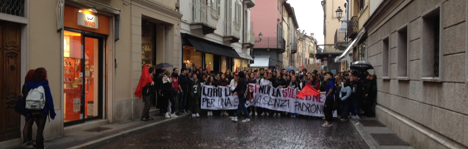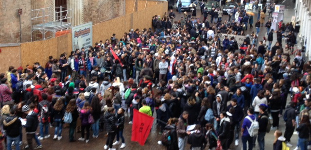 Un corteo per una scuola senza padroni, per dire no alla legge Aprea. «Così non si può più andare avanti: le aziende chiudono, non si arriva a fine mese, il governo taglia pensioni e diritti, i libri costano sempre più, i trasporti anche, stanno privatizzando la scuola pubblica con l’ingresso di banche e aziende negli organi decisionali della scuola (pdl Aprea), i figli dei lavoratori non avranno più diritto all’istruzione (se non pagando, ma i soldi non ci sono)». Questi il motivo dello sciopero per i ragazzi, accompagnati in corteo anche dai docenti. Una manifestazione, animata, ma tranquilla, senza scontri con le forze dell’ordine, come successo in altre città italiane, che per tutta la mattinata ha visto uniti studenti e lavoratori per dire basta all’austerità.