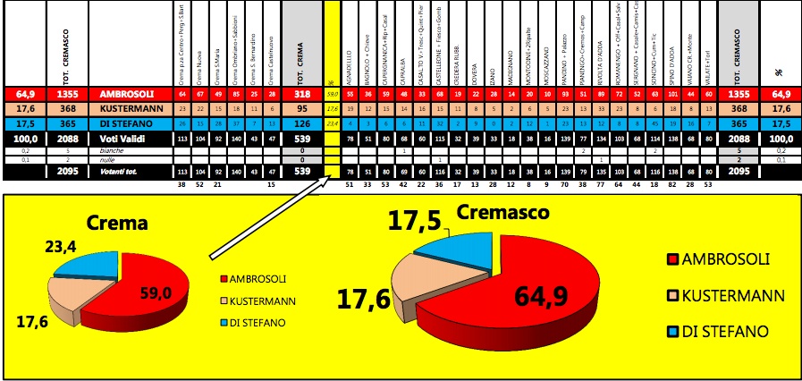 AGGIORNAMENTO ORE 21.15 – Terminato lo spoglio. Il dato definitivo del totale dei votanti è di 5.016 cremonesi ai seggi in provincia. I risultati: Ambrosoli ha preso 3.319 preferenza (66,2%), Kusterman 974 (19,4%), Di Stefano 723 (14,4%).