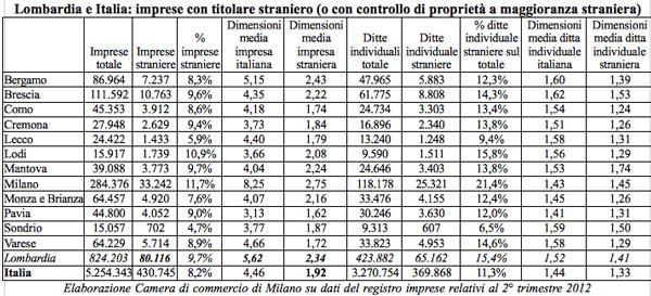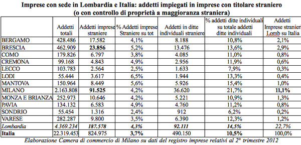Sono oltre 187 mila i posti di lavoro creati dalle 80 mila imprese con titolare straniero che hanno sede in Lombardia, pari al 4,3% del totale degli occupati creati dalle imprese lombarde nel settore privato, un dato superiore alla media italiana ferma al 3,7%. Se consideriamo poi le sole micro-imprese (ditte individuali) straniere il numero di occupati si attesta ad oltre 92 mila, pari al 14,5% dell’occupazione creata da tutte le ditte individuali della Lombardia, indipendentemente dalla loro nazionalità (superiore al dato italiano fermo a 10,5%). Emerge da una elaborazione Camera di commercio di Milano su dati del registro imprese relativi al secondo trimestre 2012 (titolare non nato in Italia o con controllo di proprietà a maggioranza di persone non nate in Italia). In provincia di Cremona sono 4.843 gli addetti creati da imprese straniere (lo 0,6% del dato complessivo italiano). La percentuale degli addetti imprese straniere sul totale (99.168) è di 4,9%. 2.956 sono gli addetti in ditte individuali straniere (l’11,9% sul totale). Su 27.948 imprese nel cremonese, 2.629 sono quelle straniere (il 9,4%). 2340 sono quelle individuali.