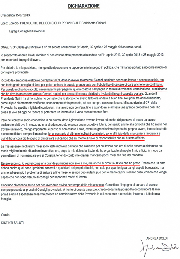 Il consigliere Andrea Doldi resterà al suo posto in consiglio provinciale nonostante le tre assenze consecutive dell’11 aprile, 30 aprile e 28 maggio. Lo ha deciso l’ufficio di presidenza nel primo pomeriggio di venerdì 19 luglio. “Abbiamo discusso – afferma il capogruppo Pdl Gabriele Gallina – sono state manifestate varie opinioni, poi si è deciso, viste anche le motivazione portate per iscritto da Doldi, di non procedere oltre con l’iter che avrebbe portato alla sua decadenza”. Una scelta “a maggioranza”, la definisce il consigliere indipendente Massimo Araldi: “Con tutto il rispetto per la persona, se c’è un regolamento non vedo perché non lo si debba rispettare. Però chiederò che vengano resi pubblici tutti i dati di presenza e di attività dei consiglieri”. Ma il consiglio provinciale che ha fatto seguito all’Ufficio di presidenza si è aperto subito nel segno della polemica con la dichiarazione di Fabio Bertusi (Pdl) sulla nomina di Gallina (invece di Antonio Agazzi, assente giustificato nelle seduta odierna) a capogruppo: “Non posso che esternare tutto il mio rammarico nell’apprendere soltanto ora l’ufficialità rispetto all’avvicendamento del capogruppo del gruppo al quale aderisco – ha detto Bertusi in consiglio – Una vicenda mal gestita, che al di la della sostanza della scelta (non si può infatti non prendere in considerazione la mancanza di ben 4 firme a sostegno) credo che abbia lasciato i suoi maggiori strascichi sulla forma, ovvero sulle modalità un po’ sovietiche che hanno trascurato il dibattito, il confronto e la compartecipazione su una scelta strategica non solo per il nostro gruppo, ma a maggior ragione su tutta la maggioranza che sostiene il Presidente Salini. In tutta questa vicenda, mi è doveroso ringraziare a nome del partito che rappresento il consigliere Antonio Agazzi che in un momento difficile di transizione ha gestito al meglio un ruolo tutt’altro che facile. Il Partito ha apprezzato l’ottimo lavoro del nostro capogruppo facente funzioni, la sua ricerca spasmodica per il dialogo e la capacità di mediazione con la quale ha gestito partite anche complesse. Mi rivolgo quindi al Presidente Salini, perché possa, con l’autorevolezza che lo contraddistingue, cercare da subito di imbastire nuovamente un adeguato dibattito democratico interno alla maggioranza nell’interesse di tutta l’istituzione che rappresentiamo e nell’interesse di tutti i cittadini cremonesi”.