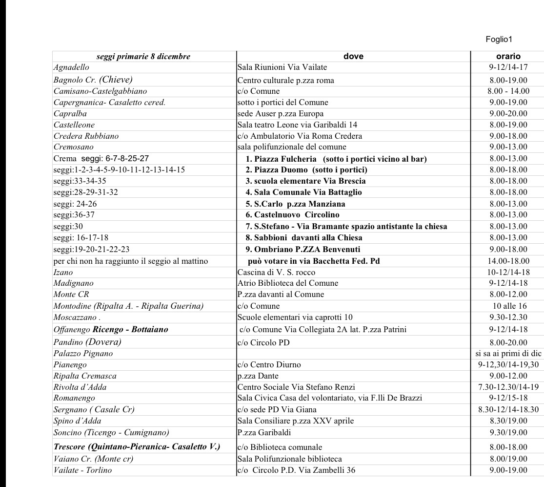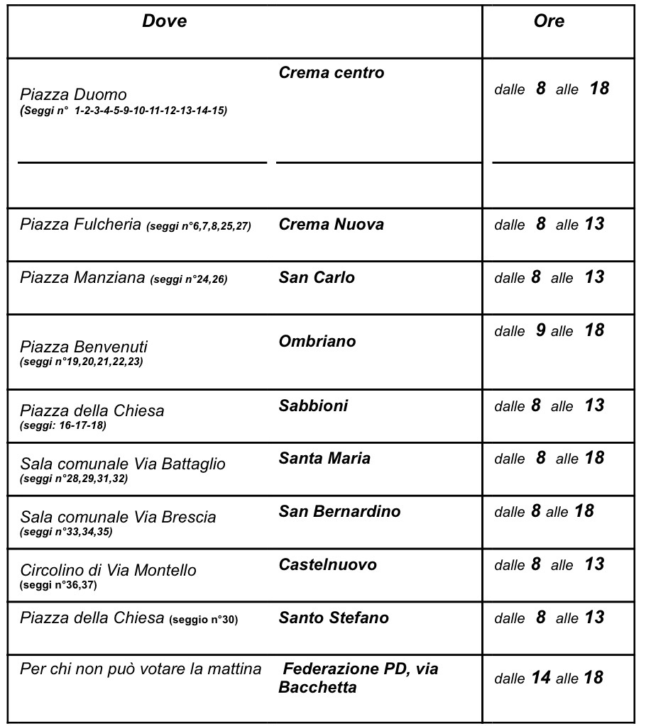 A Crema i seggi saranno nove, più uno pomeridiano dalle 14 alle 18 nella Federazione di via Bacchetta. Nel Cremasco i seggi totali, Crema compresa, saranno 36.