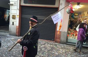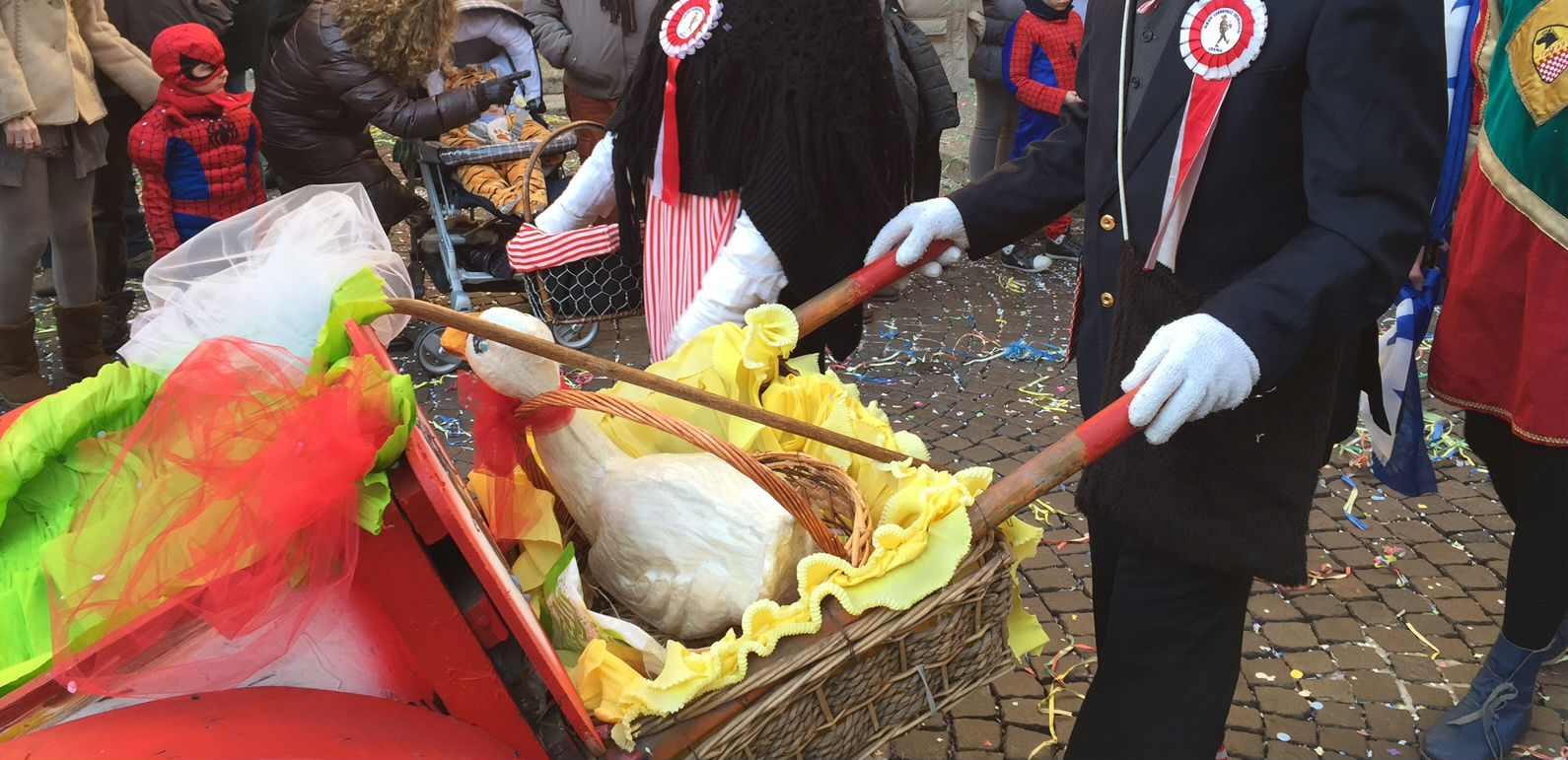 del centro e anche una polemica. Dietro la volante della polizia, che apriva il corteo, ecco le maschere del gagèt col so uchèt, dove l’uchèt era di cartapesta. Un po’ di delusione da parte di chi voleva vedere come andava a finire la diatriba tra il comitato del carnevale e il gruppo dei Pantelù, che ha minacciato di sfilare con un ì’oca arrosto con tanto di patate, quando è passato Renato Stanghellini, anima dei Pantelù, con un’oca di gomma spennata e un cartello polemico. Tutto qui? per il momento sì, ma in molti attendono il colpo di coda… Buona la prima, dunque, in attesa della primissima, quella di domenica prossima con città chiusa e ingresso a pagamento (7 euro e sconti per i ragazzi) e con l’ingresso dei grandi carri in competizione. Unica incertezza, il meteo, che proprio per domenica dà neve. ma da qui a sette giorni ne cambiano di cose…