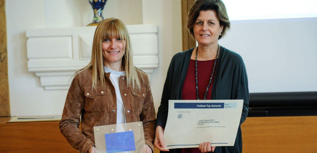 La professoressa Ilaria Valente del Politecnico consegna il premio alla collega Camilla Cervi che lo ritira a nome del liceo Scientifico di Crema