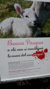DOVERA – Un agnellino con la sua mamma che lo accarezza con muso, un’immagine tenera e poi un augurio: buona Pasqua a chi non si macchierà le mani del suo sangue. Un messaggio forte appeso ai muri di Dovera da AgireOra, un’associazione vegana che invita a passare dall’alimentazione animale a quella vegetale. Cartelli che invitano a non mangiare agnello nel giorno di Pasqua, come da tradizione, stanno spuntando un po’ dappertutto e, a quanto pare, le vendite di carne d’agnello negli ultimi anni sono sensibilmente calate: oltre 3000 chili lo scorso anno, poco più di 2000 quest’anno, con circa 200 piccoli salvati. Si pensi che gli agnelli uccisi in Italia in un anno sono circa 4milioni e nel periodo pasquale vengono macellati circa 800mila piccoli, agnellini nati da poche settimane.
