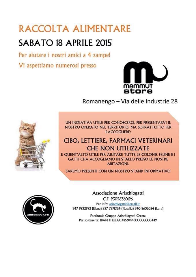 Sabato, 09-19.30, Romanengo. All’esterno del negozio Mammut, nella zona industriale, gazebo dell’associazione Arischiogatti che raccoglie cibo, farmaci e materiale utile per i gatti randagi.