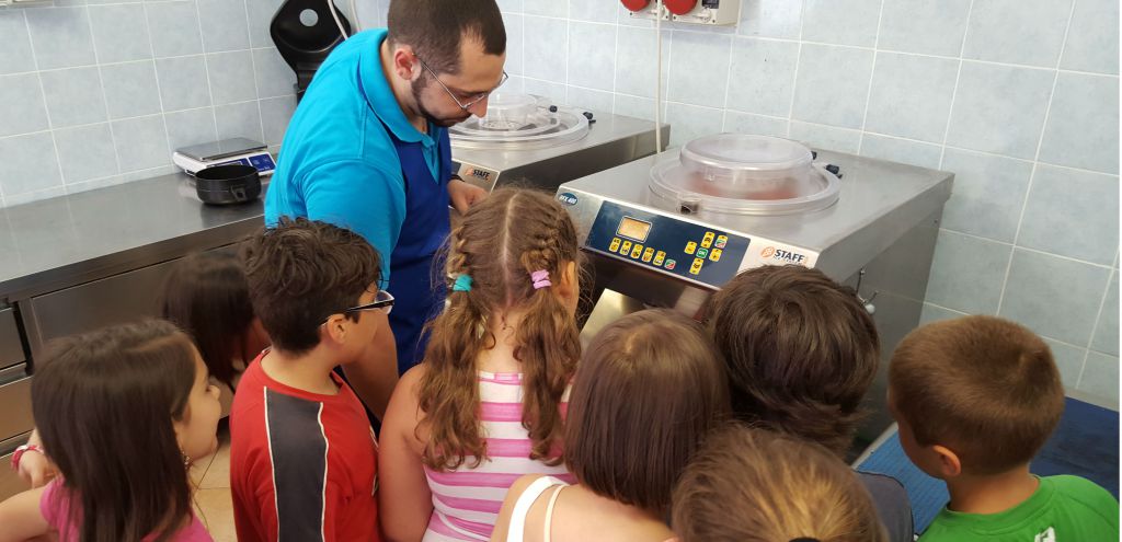 Il gelataio mostra ai ragazzi la lavorazione del gelato