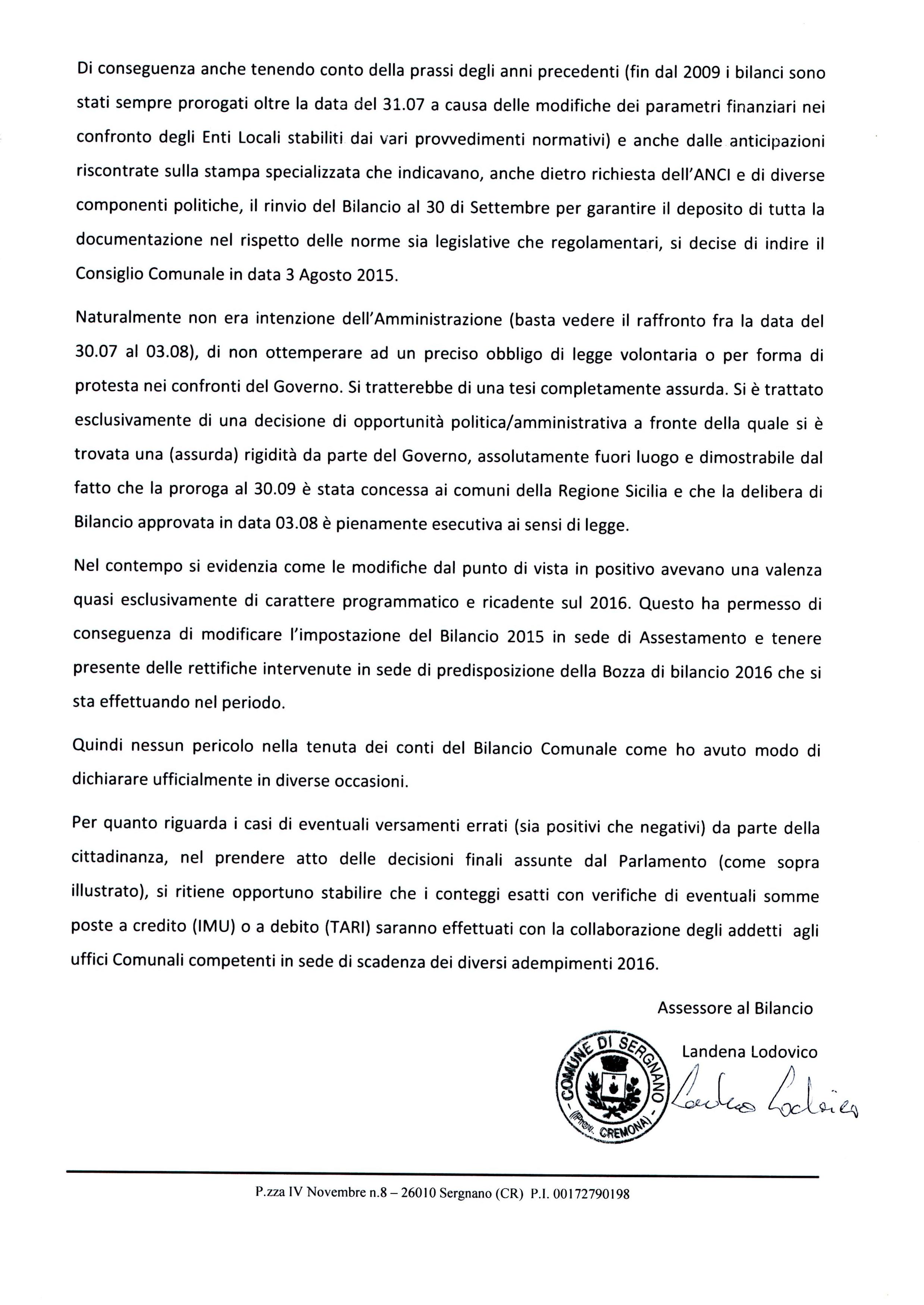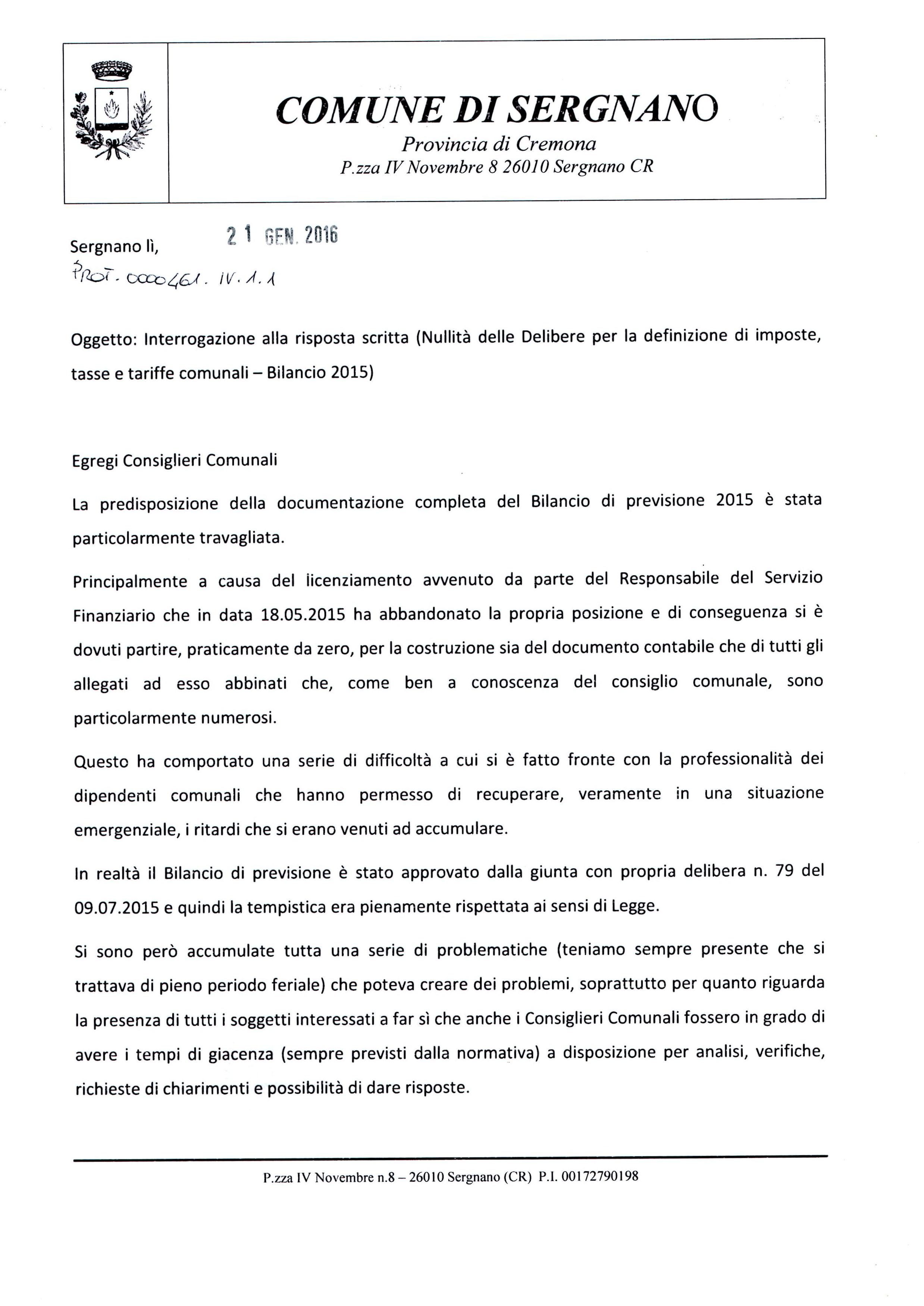 Gli attacchi al Governo, nella risposta dell’assessore Landena, “ci sembrano assai forzati – commentano i consiglieri – richiamiamo quindi l’assessore Landena ad assumersi pienamente le proprie responsabilità in questa vicenda, che ha portato le delibere inerenti al bilancio comunale 2015 ad essere dichiarate nulle, comportando un danno d’immagine grave per l’amministrazione, un aggravio di lavoro per i dipendenti e uno strascico di ulteriori incombenze per i cittadini di Sergnano. A questo proposito confidiamo inoltre che vengano chiariti in modo chiaro ed univoco le modalità di rimborso o accredito dei differenziali durante gli adempimenti fiscali 2016. Per noi il caso non è ancora chiuso: chiediamo una più netta assunzione di responsabilità da parte dell’amministrazione comunale e un’informazione puntuale della cittadinanza a riguardo”.