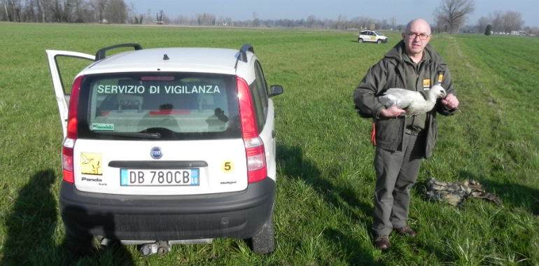 Parco Adda sud, task force Gev recupera e salva cicogna ferita