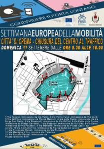 Dal 16 al 22 settembre anche a Crema si terrà la Settimana Europea della Mobilità. Promossa dal Ministero dell’Ambiente l’iniziativa è volta a promuovere ed incentivare la sostenibilità ambientale migliorando il sistema di trasporti urbano e la vivibilità dei centri urbani. L’edizione 2017 conta ad oggi la partecipazione di 2.100 città, per un totale di 477 iniziative organizzate in 40 Paesi e ispirate alla tematica della Mobilità pulita, condivisa e intelligente.