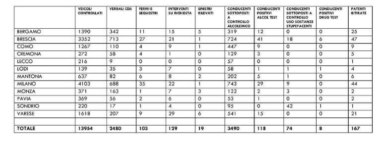 A livello regionale, al termine dell’operazione sono stati 13.954 i veicoli controllati in tutta la regione; 2480 i verbali elevati per infrazioni al codice della strada; 3.490 i conducenti sottoposti a test alcolemico, di cui 118 positivi; 74 i drug test effettuati, e 8 persone sono risultate positive; 167 le patenti ritirate; 103 i veicoli sottoposti a fermo o sequestro; 19 i sinistri rilevati e 129 gli interventi effettuati su richiesta.