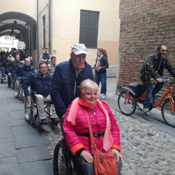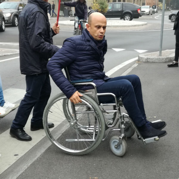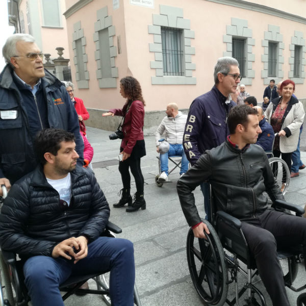 Amministratori in sedia a rotelle con 'Crema Zero Barriere' per scoprire gli ostacoli della città