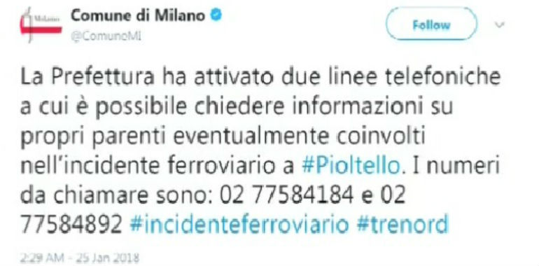 La Prefettura di Milano ha attivato due linee telefoniche a cui chiedere informazioni su parenti eventualmente coinvolti nell’incidente ferroviario di questa mattina a Pioltello. Al momento le vittime accertate sono 3, tutte donne.