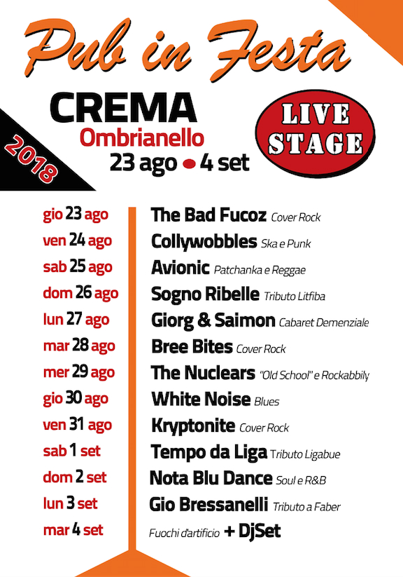 Tra le novità che caratterizzeranno l’edizione 2018 della festa di Ombrianello a Crema ci sarà l’area bar-eventi “Pub in Festa”. Si tratta di un nuovo spazio dedicato ad un pubblico “alternativo” rispetto ai soliti frequentatori della balera o degli altri ristoranti della Festa cremasca de l’Unità (che si terrà da giovedì 23 agosto a martedì 4 ottobre).