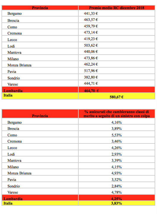 Guardando i dati a livello territoriale, invece, risulta che la provincia di Como (5,53%) e quella di Monza e Brianza (4,93%) sono le due in cui, percentualmente, si è registrato il maggior ricorso alle assicurazioni per denunciare sinistri con colpa. Sondrio (2,84%) e Lodi (2,93%), di contro, quelle con i valori più bassi. Cremona, invece, fa registrare un dato sostanzialmente in linea con quello nazionale (3,46% in provincia, 3,83% in Italia) ed inferiore a quello lombardo (4,85%): si tratta del quarto miglior dato in Regione. Per quanto riguarda il premio medio di dicembre 2018, infine, tutte le province lombarde si collocano sotto la media nazionale (464,70 euro il dato lombardo, 580,67 euro quello italiano). Nel dettaglio il premio medio più basso si registra a Sondrio (382,80 euro), seguito da Lecco (419,23 euro) e Mantova (440,06 euro). In fondo a questa particolare graduatoria, invece, troviamo Pavia (517,96 euro), preceduta da Lodi (503,62 euro), Milano (473,86 euro) e Cremona (473,14 euro).