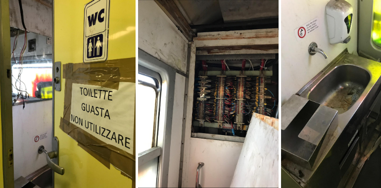 Pannelli divelti, cavi scoperti e bagni rotti: il degrado sui treni dei pendolari