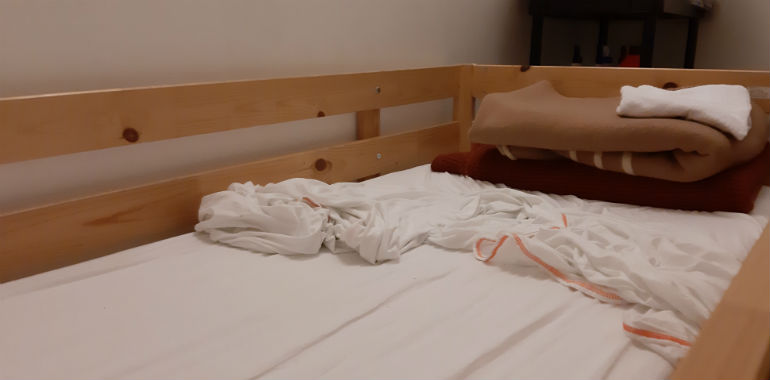 18 posti letto che, quest’anno, non sono tutti occupati: “L’anno scorso a gennaio eravamo pieni – spiega Filippo – Mettiamo a disposizione tutto il necessario, dagli spazzolini da denti al sapone fino a caffè e tè caldi”. Nella cucina spartana c’e un ragazzo che prega verso la Mecca, un altro si prepara una tazza di latte, entrambi in assoluto silenzio.