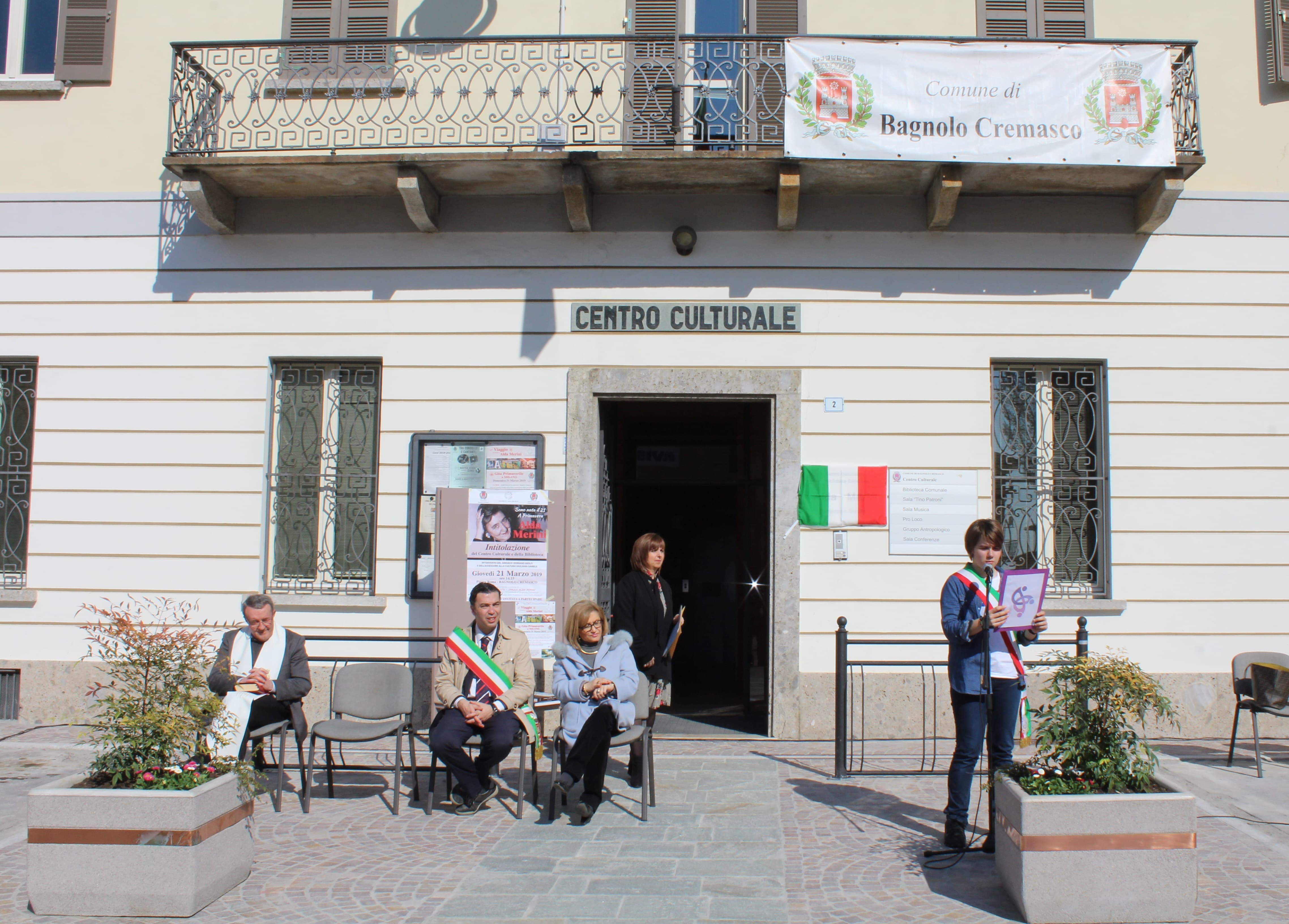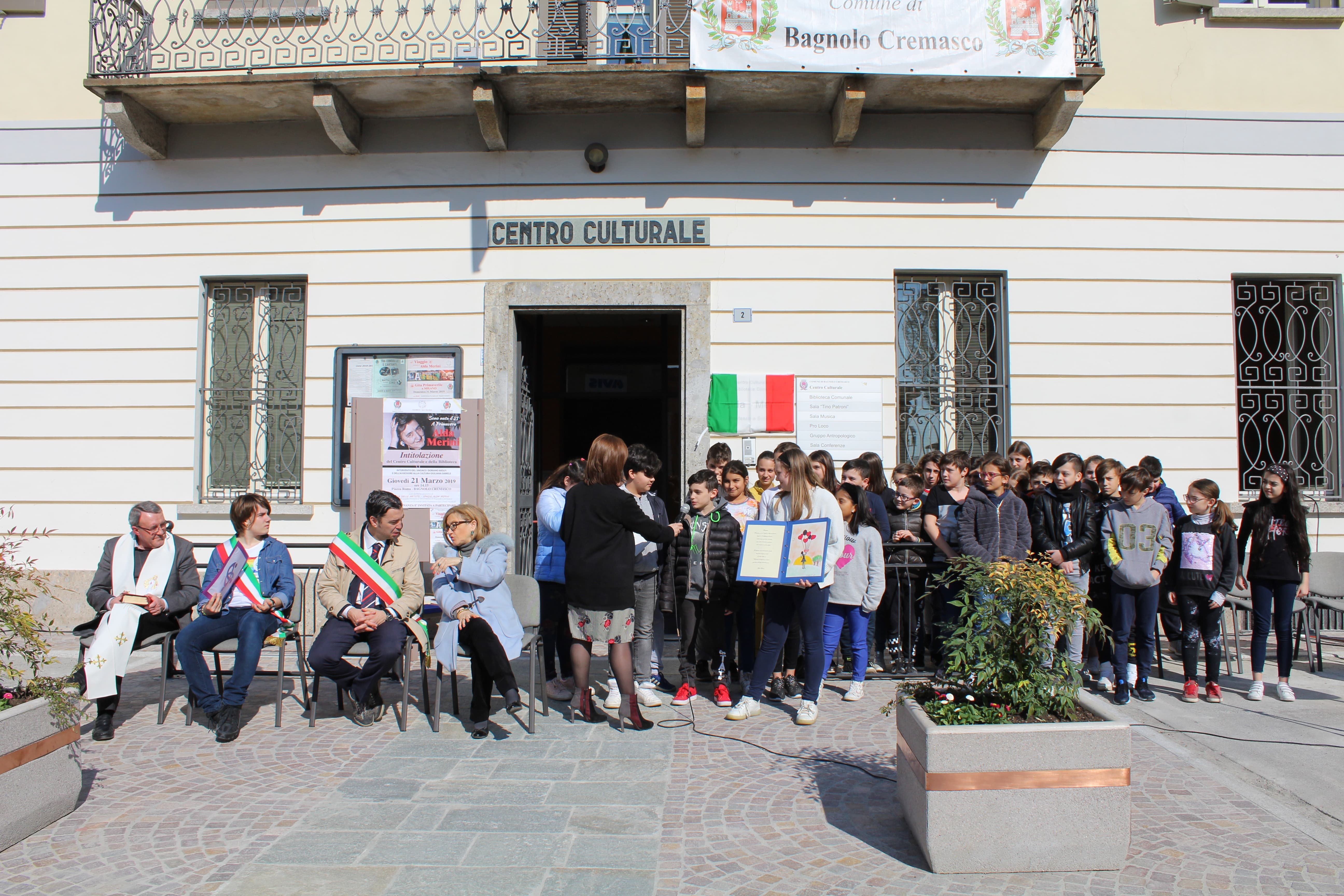 Nella giornata mondiale della poesia, si è tenuta nel pomeriggio di ieri in piazza Roma, la cerimonia di intitolazione del centro culturale e della locale biblioteca alla poetessa Alda Merini, che tra l’altro ieri avrebbe festeggiato l’ottantottesimo compleanno. La cerimonia, che ha coinvolto la Casa delle Artiste – spazio Alda Merini, oltre alla partecipazione dell’amministrazione comunale di Bagnolo Cremasco, guidata dal sindaco Doriano Aiolfi e quella del parroco, don Mario Pavesi ha visto una folta rappresentanza degli alunni della scuola primaria e di quella secondaria di secondo grado di Bagnolo. In particolare, due classi quarte e due classi quinte della primaria di Bagnolo e una delegazione di alunni della scuola media, i quali, coinvolti dal prof. Loris Facchin si sono occupati di proporre alcuni intermezzi musicali. Nutrita anche la presenza del consiglio comunale dei ragazzi, con il sindaco Laura Lacchinelli, e la vice Fiona Kadria, che sono intervenute, la prima, descrivendo la vita della poetessa e la seconda, leggendo la poesia La pace.