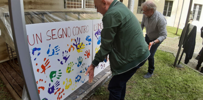 Tante mani colorate hanno riempito i pannelli sui quali campeggia la scritta “Un segno contro l’omotransfobia”. Presenti il sindaco Bonaldi e gli assessori Emanuela Nichetti e Michele Gennuso. L’evento è stato documentato attraverso un breve video, che sarà diffuso attraverso i canali della rete RE.A.DY, alla quale aderisce il Comune di Crema.