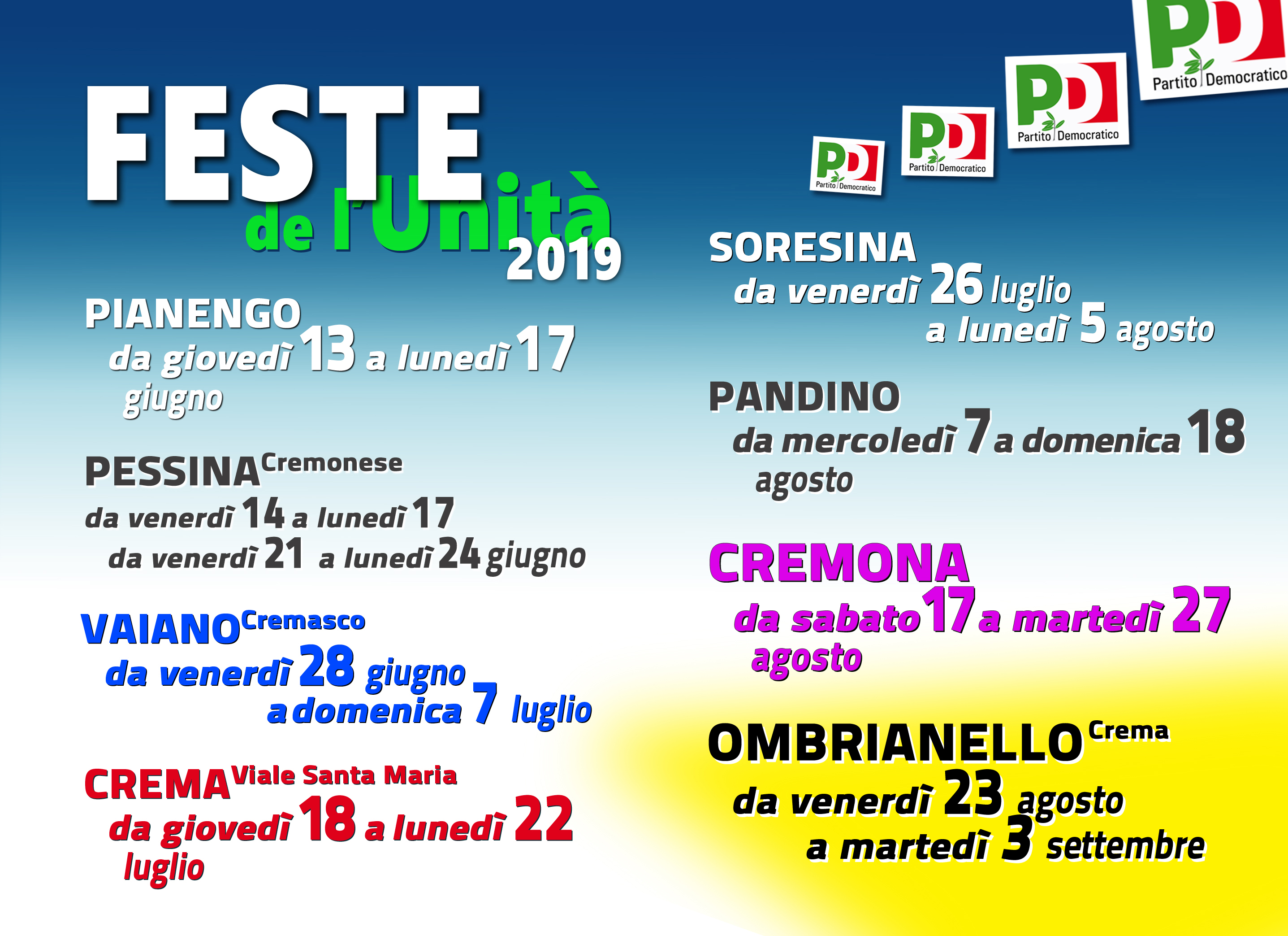 In vista dell’estate, torna la stagione delle Feste dell’Unità: da giugno a settembre saranno 8 in totale le feste organizzate dal Partito Democratico in Provincia di Cremona. Ad inaugurare il calendario, Pianengo, che aprirà al pubblico da giovedì 13 a lunedì 17 giugno. Riconfermati i due eventi più attesi di fine estate: la festa della città di Cremona (dal 17 al 27 agosto) e la grande kermesse di Ombrianello (dal 23 agosto al 3 settembre), che chiuderà la stagione 2019.