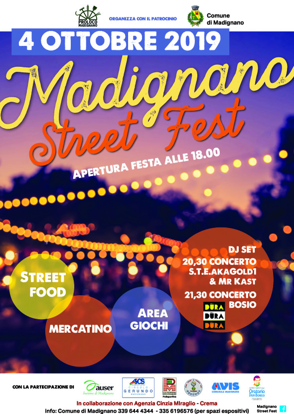La ProLoco di Madignano venerdì 4 Ottobre – nella centrale Piazza dei Portici – con il Patrocinio dell’Amministrazione comunale e la collaborazione dell’Agenzia Cinzia Miraglio di Crema, la prima edizione di MADIGNANO STREET FEST: Street food, musica dal vivo, bancarelle, area giochi per bambini e uno spazio per le associazioni del paese.