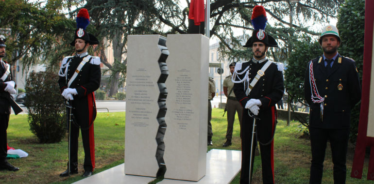 L’opera. In rappresentanza del Comitato organizzatore, Fabiano Gerevini ha voluto esprimere sentimenti di ringraziamento, verso tutti coloro che hanno contribuito alla realizzazione del monumento, ed alle aziende locali che hanno consentito di abbattere i costi dell’opera. L’architetto Mario Scaramuzza in qualità di progettista, ha descritto il significato, il messaggio che intende veicolare e i materiali. L’immagine complessiva del monumento, vuole trasmettere all’osservatore un insieme di messaggi, ha ribadito l’architetto, al fine di unire sentimenti di gratitudine e patriottismo. Il marmo simbolo di tenacia, il nero opaco della crepa verticale a simboleggiare la distruzione, l’erba verde che sbuca dalla crepa che simboleggia la vita, il tricolore e le diciannove barre di acciaio che tengono unite le due parti di cui si compone l’opera, a simboleggiare la forza dei soldati.