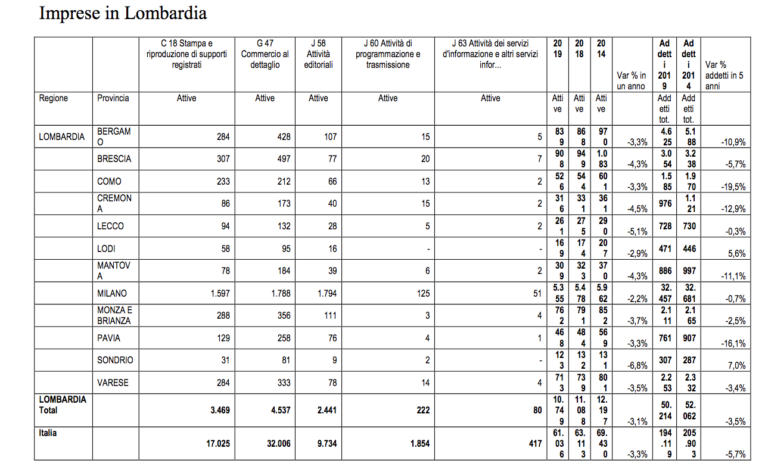 I dati sono stati elaborati dalla Camera di commercio di Milano Monza Brianza Lodi al secondo trimestre 2019. “La cultura – ha dichiarato Guido Bardelli, membro di giunta della Camera di commercio di Milano Monza Brianza Lodi – è un settore importante per la Lombardia e per le sue imprese. Interessante la crescita delle librerie,un indicatore molto positivo di partecipazione e di interesse alla lettura, che può creare benefici in modo generalizzato, grazie ad una formazione più adeguata”.