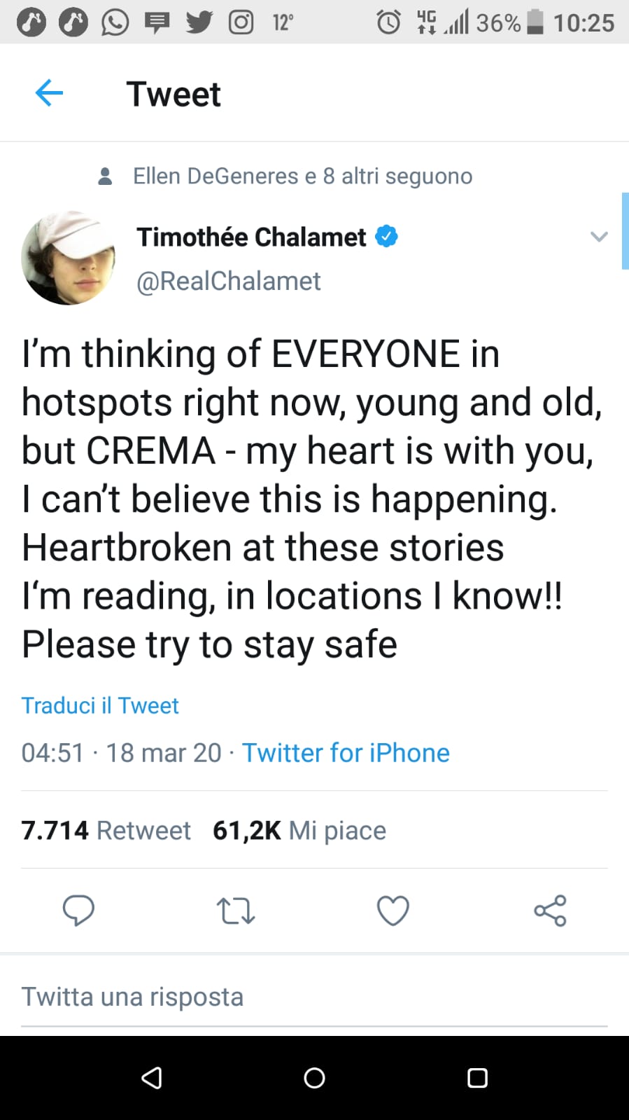 “Crema, il mio cuore è con voi”. Sono le parole che l’attore Timothée Chalamet ha dedicato alla città in un momento difficile come quello dell’emergenza coronavirus.