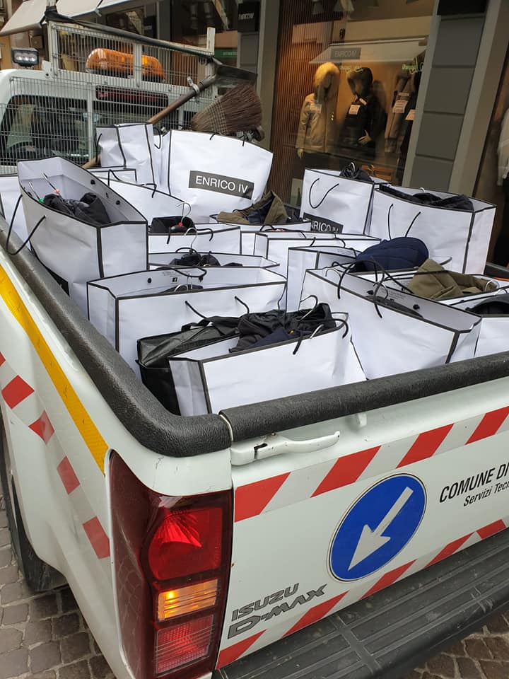 Il sindaco Bonaldi ha poi diramato un appello – tramite Facebook – ai comemrcianti cittadini se potessero donare i propri fondi di magazzino invenduti. La risposta degli esercenti non si è fatta attendere: “La generosità e solidarietà di queste ore è commovente e siamo già nelle condizioni di sospendere la raccolta. Abbiamo già raggiunto un numero davvero consistente di capi, parecchi depositati all’Ospedale da Campo e altri direttamente agli alloggi. Al momento, ancorché parziale, poi integreremo, voglio ringraziare il negozio Enrico IV di Crema, Coop Lombardia e l’Associazione Clown per i carichi davvero eccezionali”.