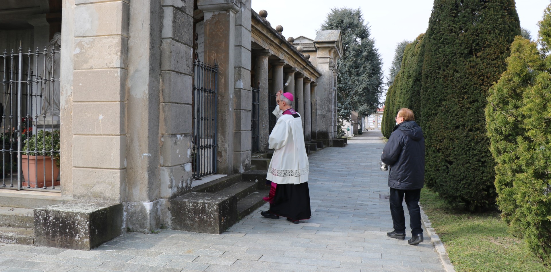 Dopo il momento di preghiera, svolto davanti alla cappella del Cimitero, il vescovo, accompagnato dal cappellano don Giuseppe Pedrinelli, è passato nei vari settori del cimitero per aspergere con l’acqua benedetta le tombe dei defunti.