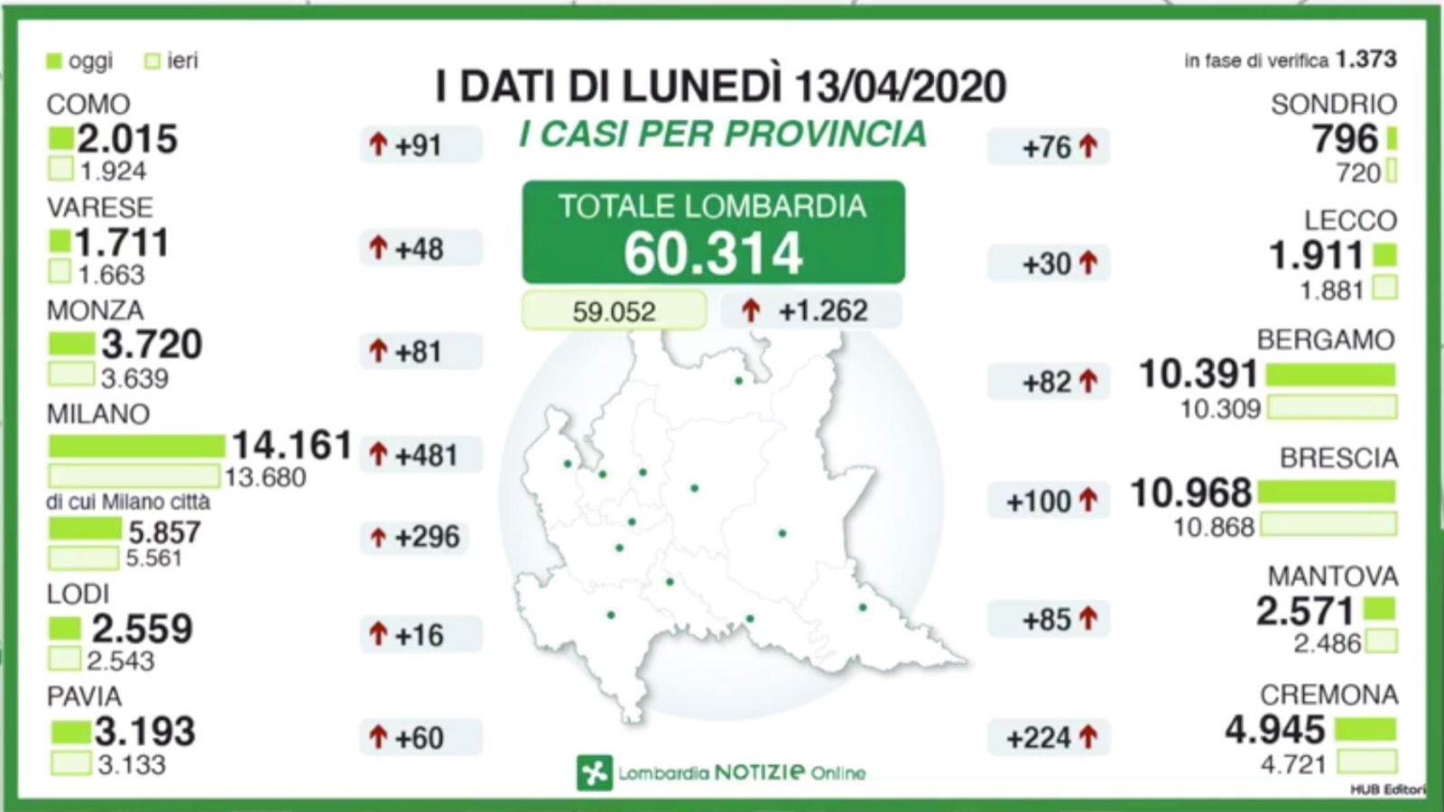A livello regionale i positivi salgono complessivamente a 60.314, 1.262 in più ma i tamponi sono stati solo 5.260). Aumentano anche i decessi, a livello regionale: +280 in un giorno, per un totale di 10.901. Calano ancora i ricoveri in terapia intensiva, di 33 unità.