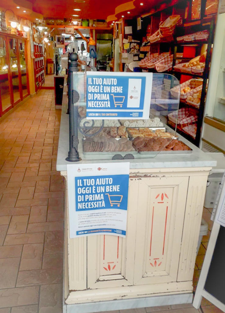 Sia i negozianti che la grande distribuzione hanno accordi specifici per il ritiro dei beni alimentari donati dai loro clienti, con referenti sempre pronti, ad esempio in caso di alimenti freschi. Questi carrelli di spesa donata confluiscono come parte essenziale dei pacchi alimentari gestiti dalla stessa Caritas.