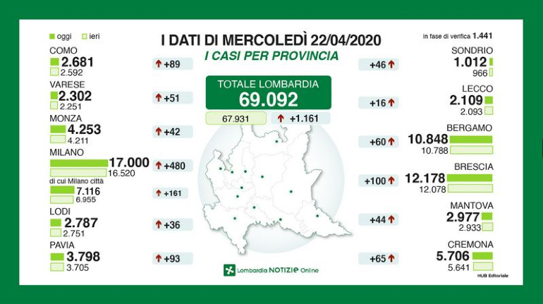 E’ sempre Milano la provincia con il maggior numero di contagi (17mila) e sempre con una crescita importante (+480). A crescere maggiormente tra ieri e oggi, mercoledì 22 aprile, sono state Brescia (+100, totale 12.078), Pavia (+93, totale 3.798) e Como (+89, totale 2.681).