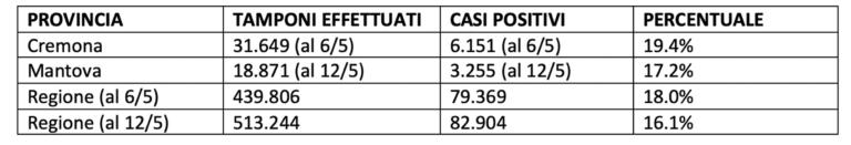 Guardando al dato provinciale complessivo (Cremona, Casalmaggiore e Crema) abbiamo dunque 31.649 (o 39.649, sempre per il dubbio riportato prima) tamponi effettuati fino al 6 maggio, quando i casi positivi erano stati 6.151. Si oscilla perciò tra un 19.4% e un 15.5%. La media regionale, in data 6 maggio, è stata del 18%, dunque il dato cremonese e cremasco è in linea, anzi di poco superiore, se prendiamo per buona l’ipotesi più probabile, ossia che gli 8.000 tamponi iniziali siano stati “assegnati” altrove. Va precisato che questo dato non ha nulla a che vedere con l’incidenza del Coronavirus in provincia di Cremona, che rimane la più alta in tutta la regione, perché in questo caso il calcolo viene fatto sul numero degli abitanti: insomma è un dato figlio di un conteggio completamente differente.