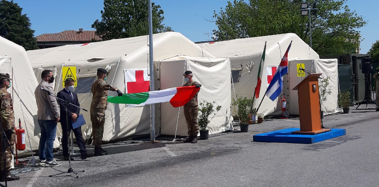 Dopo i cubani, Crema saluta anche l’ospedale da campo. Dopo la cerimonia iniziata questa mattina, lunedì 25 maggio, infatti, il presidio verrà smantellato, anche se rimarrà sicuramente nella memoria dei cremaschi. Simbolo di una strenua lotta contro il coronavirus e animato dalla solidarietà e dalla competenza della brigata medica di Cuba ‘Henry Reeve’, ma anche dai Militari dell’Esercito Italiano, il nosocomio approntato per l’emergenza ha fornito un contributo decisivo nella gestione dell’emergenza, come sottolinea il Dg dell’Assst Pellegata: “Abbiamo avuto la fortuna di avere questo aiuto nel momento più pesante: l’ospedale ha vissuto una situazione assurda con un flusso continuo di pazienti. Ci siamo trovati nella necessità di ampliare il dipartimento emergenza e la Regione ci ha proposto la possibilità di un ospedale da campo. Si è trattato di un aiuto fondamentale con cui decongestionare il Pronto Soccorso”. “L’ospedale – ha concluso Pellegata – è stato fondamentale per noi in un momento pesante: è stata una struttura di ottimo livello, frutto del lavoro sinergico tra comune, esercito e ospedale. Dobbiamo ringraziare davvero tutti”. In totale, secondo le stime fornite dallo stesso Dg, sono stati 350 i pazienti Covid, 120 i ventilati.