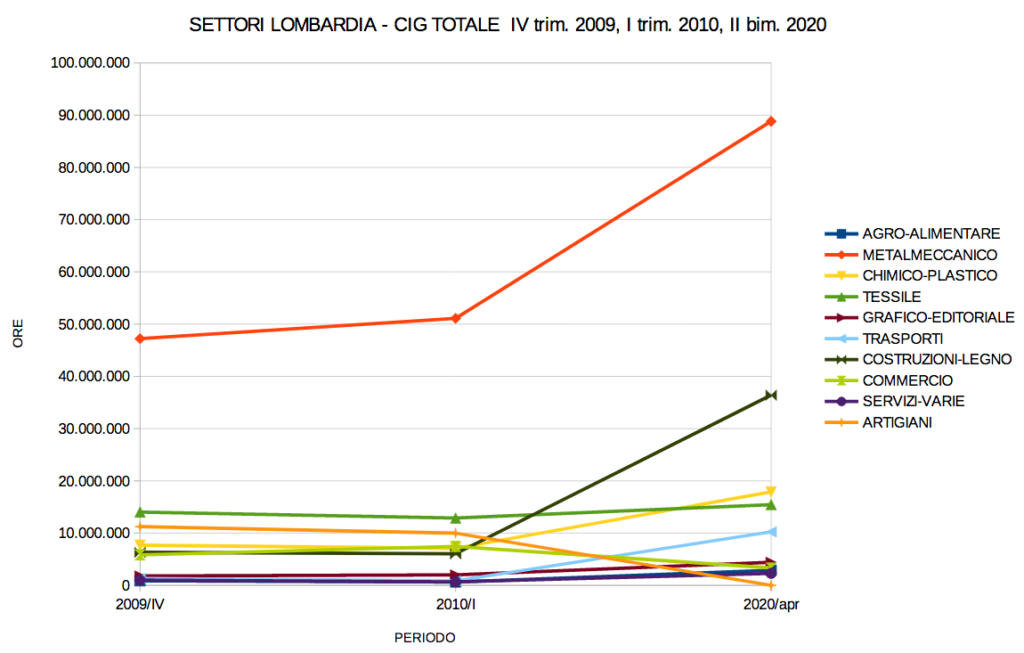 Tra le province lombarde, invece, l’incremento maggiore, sempre nel confronto con la crisi precedente, è a Sondrio, sopra il 300%, seguono Lodi e Mantova con incrementi superiori al 200%, seguite da Milano e Bergamo con incrementisuperiori al 100%. Sempre in Regione, tra i settori il più colpito è quello dei trasporti, con un incremento del 698%, seguito dal settore edile con un+478% e da quello agroalimentare con un +234%. Seguono il chimico, i servizi vari e il grafico con incrementi sopra al 100% . Si sottrae singolarmente a questo trend incrementale il settore del commercio che, pur con i suoi 3,3 mln di ore richieste, arriva al 45% della cassa integrazione richiesta nel I trimestre del 2010.