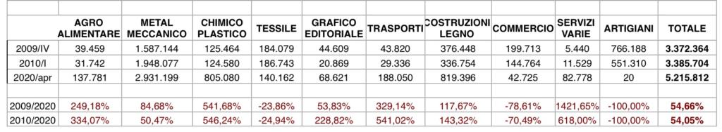 Fra i settori, in provincia di Cremona l’incremento maggiore rispetto al I trimestre 2010 è quella dei servizi con una crescita del 618,00%, seguito dal chimico-tessile con una crescita del 546,24%, poi il trasporto con una 541,02% e poi agro-alimentare con un aumento del 334,07%. Ma rispetto al IV trimestre 2009, i servizi sono aumentati addirittura del 1.421%. In calo le ore di cassa integrazione degli artigiani (-100% rispetto ad entrambi i periodi), ma anche nel commercio (rispettivamente – 78,61% e -70,49%) e nel tessile (-23,86% in confronto al 2009, – 24,94% rispetto all’anno successivo). In totale le ore richieste durante l’emergenza Covid è stata sin qui di 5.215.812 ore.