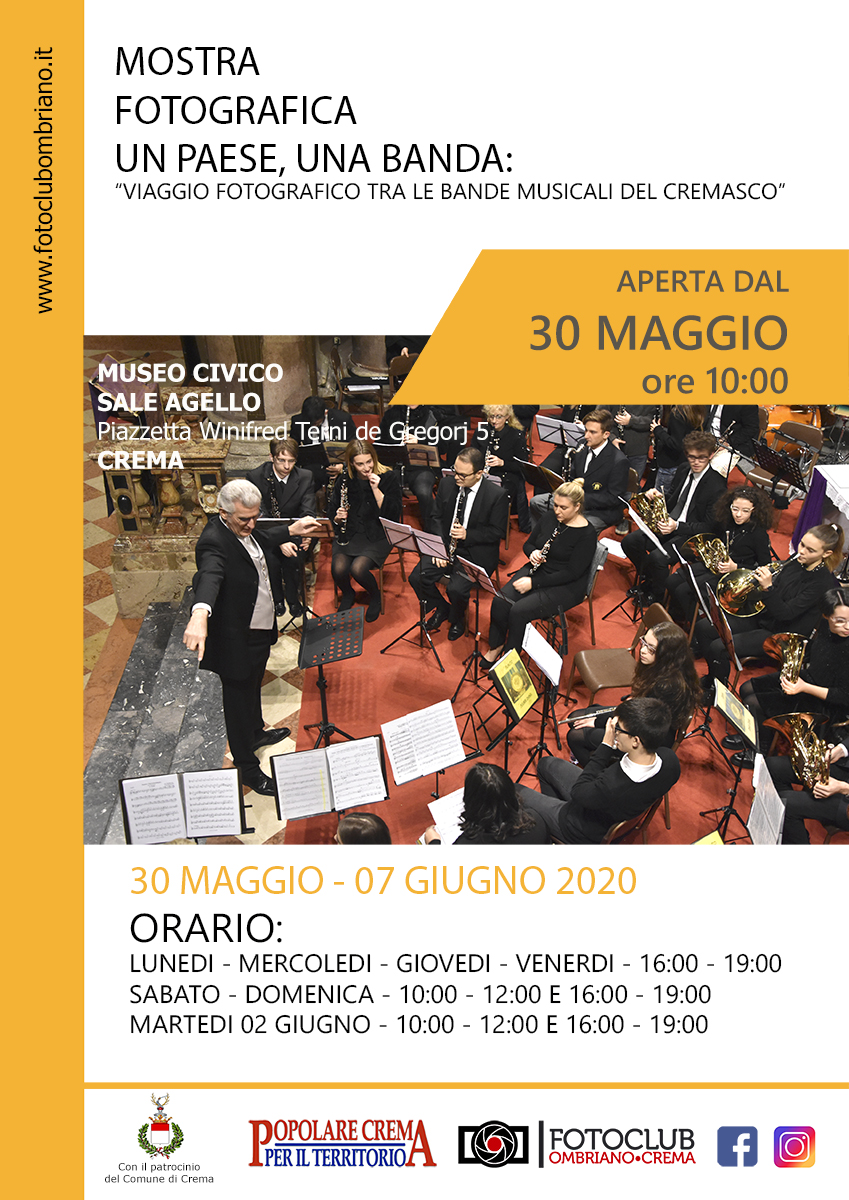Con la riapertura dei musei e delle sale espositive riparte l’arte. E Crema riparte con la mostra fotografica organizzata dal Fotoclub Ombriano-Crema e dedicata alle bande musicali del Cremasco. La mostra, sarà inaugurata il 30 maggio 2020 presso la Sala Agello del Museo Civico fino al 7 giugno.