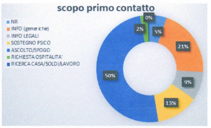 Nella maggior parte dei casi è la donna stessa a richiedere un contatto, il che indica una volontà di uscita dalla spirale di violenza. Altre volte invece si instaura un rapporto con il CAV attraverso il consiglio di parenti o amici, indicazione del pronto soccorso o forze dell’ordine o grazie al materiale informativo che l’associazione lascia in molti luoghi del territorio. Lo scopo del primo contatto è, nella metà dei casi, per sfogarsi e ricevere ascolto.