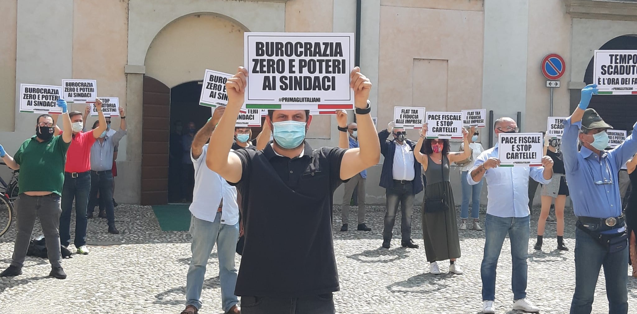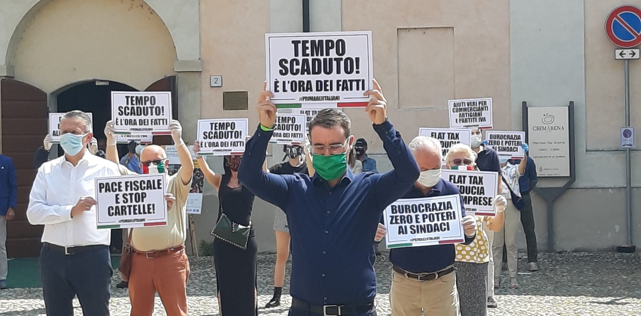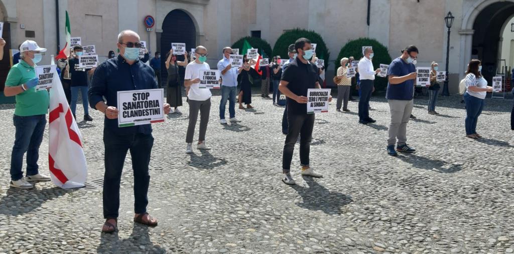 10 minuti – con mascherina e distanza di sicurezza – trascorsi in silenzio, alzando i cartelloni e chiedendo “burocrazia zero e potere ai sindaci”, “pace fiscale e stop cartelle”, “flat tax e fiducia alle imprese”, “stop sanatoria clandestini”.