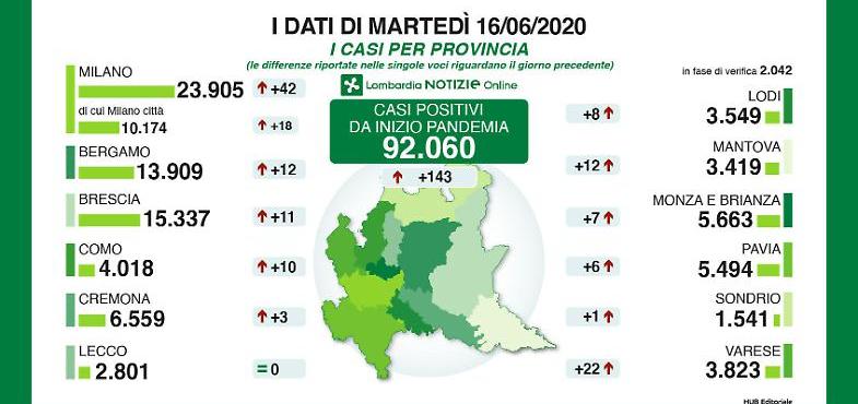 “È importante sottolineare”, ha precisato l’assessore regionale al Welfare Giulio Gallera, “che dei 143 positivi segnalati oggi in Regione un numero rilevante si riferisce a infezioni di vecchia data. Nello specifico 54 sono da attribuire allo screening sierologico regionale (di cui 18 risultati ‘debolmente positivi’). Allo stesso modo altri 24 casi sono stati riscontrati ‘debolmente positivi’ su test effettuati dietro segnalazioni di medici di famiglia, Ats e ospedali, a cittadini e ospiti di Rsa, segno di un finale di coda dell’infezione. Molto significativo, inoltre, il dato dei ricoverati in terapia intensiva che diminuisce di ben 25 pazienti”.